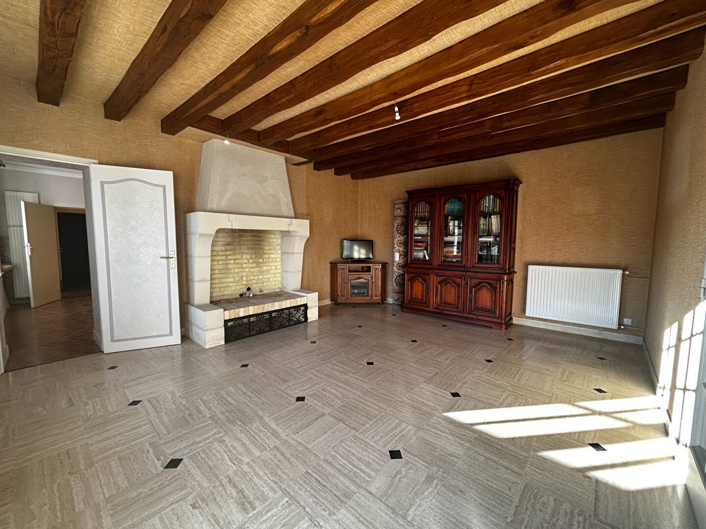 Maison de 119 m² à 10 minutes de Contres, comprenant une cuisine ouverte sur la salle à manger, un salon, une salle d'eau et deux chambres.