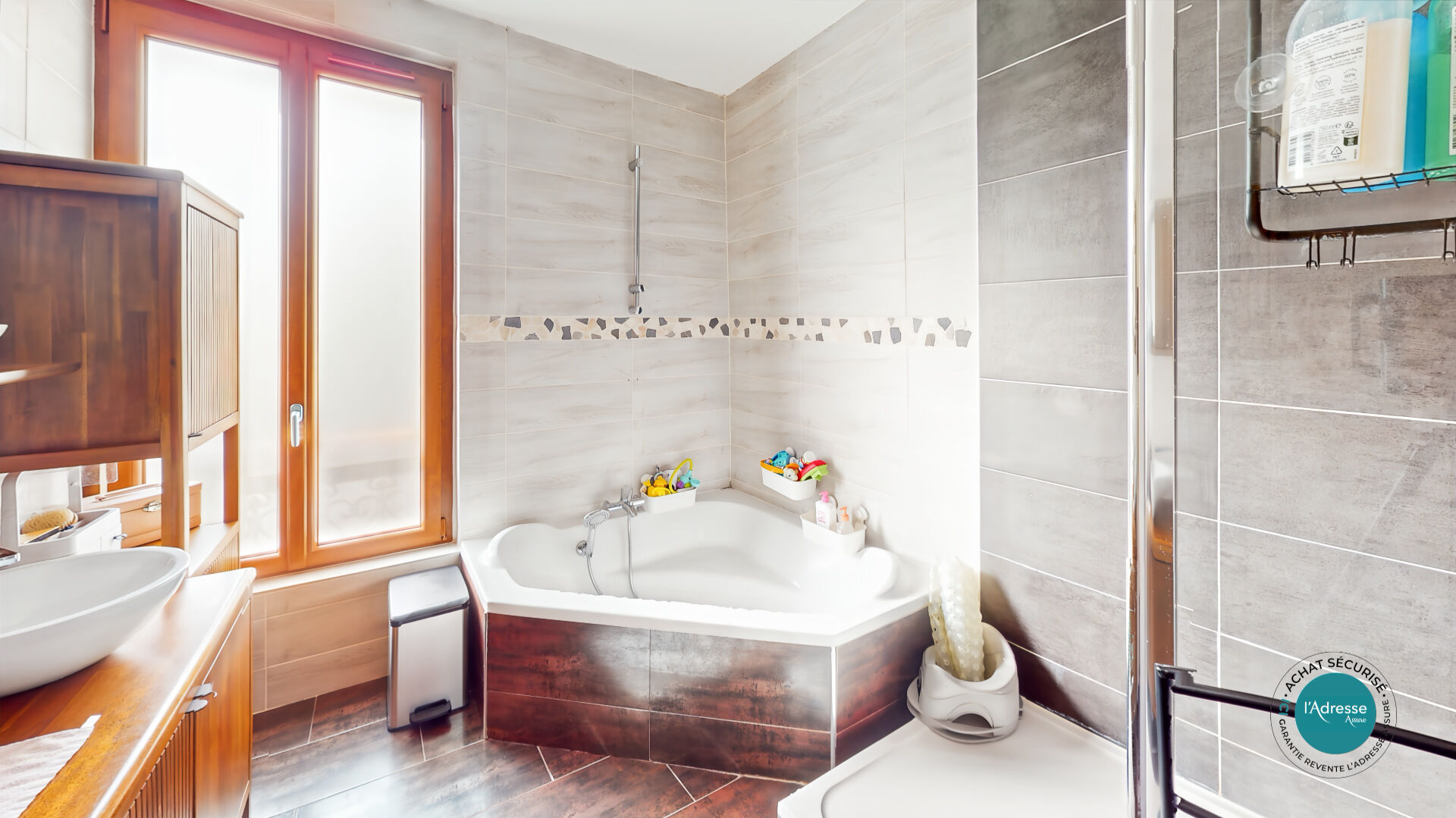 Au premier étage un bel espace salon desservant 2 chambres, une salle de bains + douche et un WC séparé.