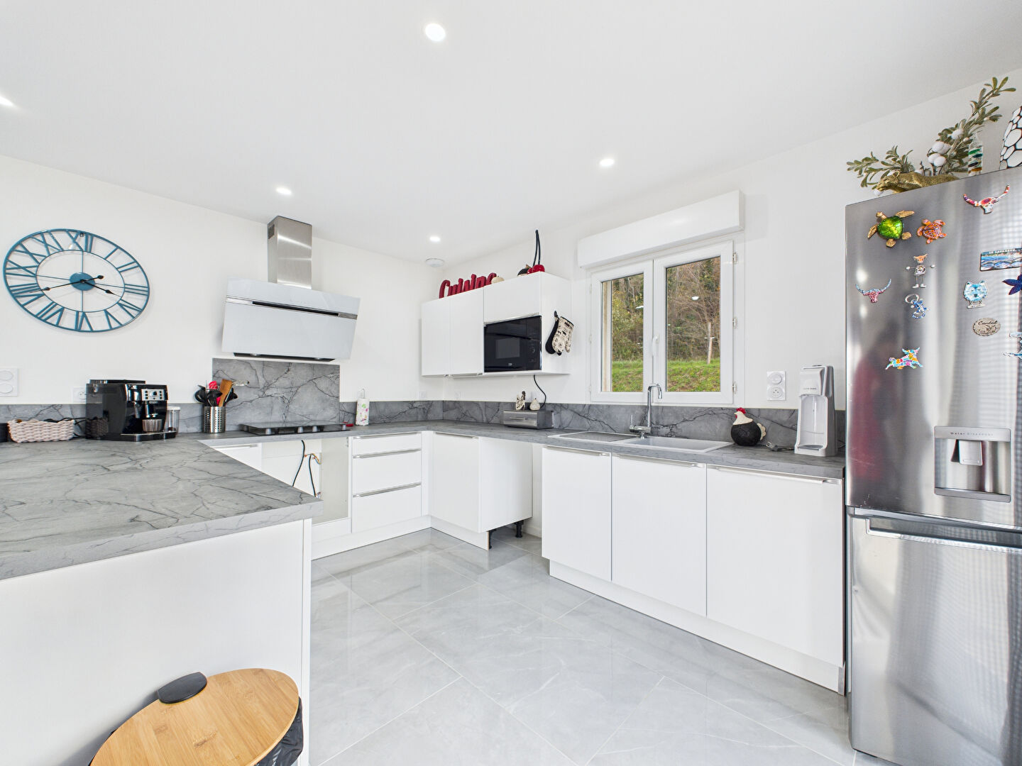 La pièce de vie, baignée de lumière, s'ouvre sur une cuisine aménagée et équipée et un séjour chaleureux animé par un poêle à granulés (programmable). Depuis cet espace, la terrasse et le jardin se dévoilent.
