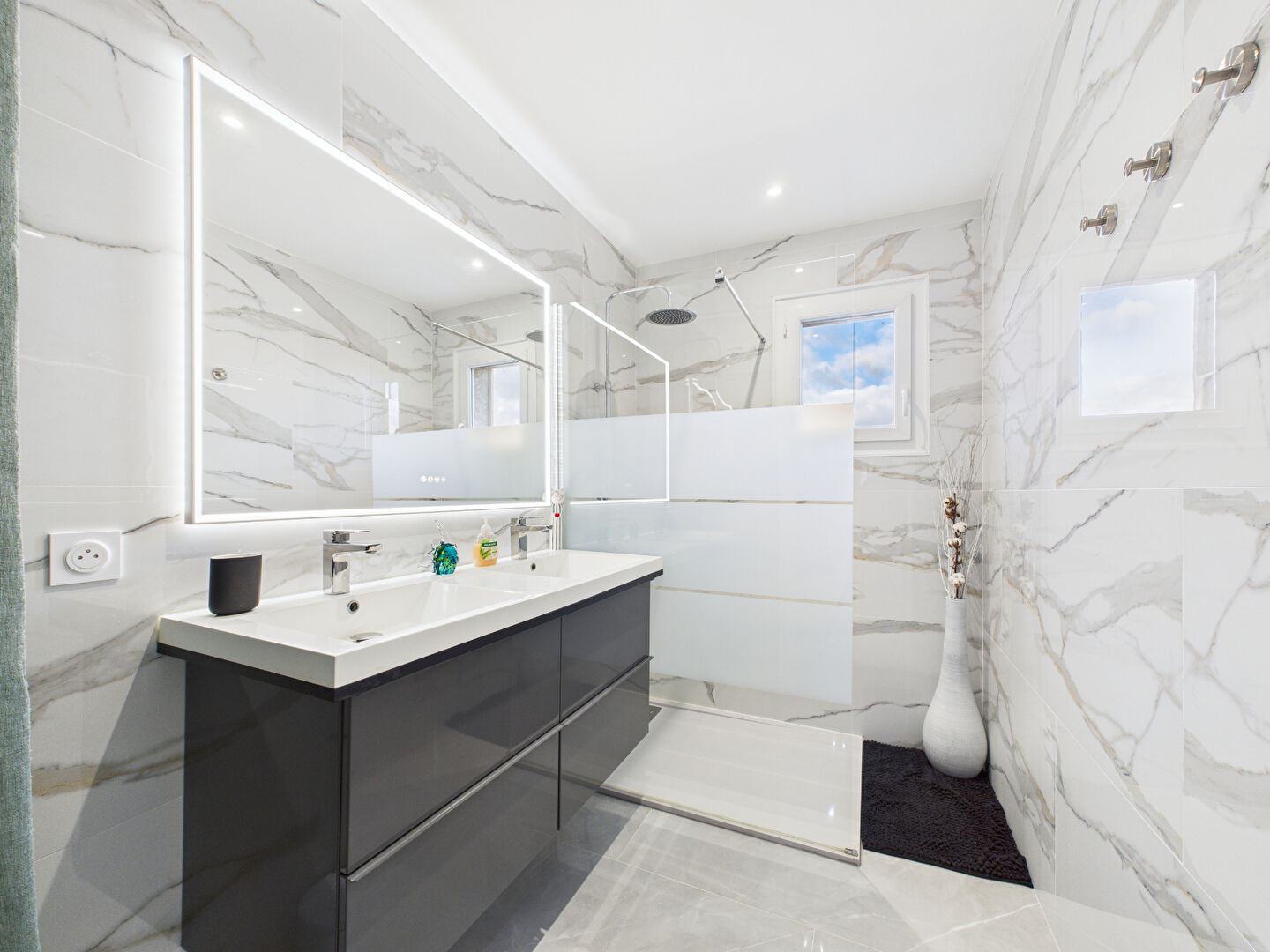 La salle d'eau, élégante et contemporaine, propose une double vasque et une douche à l'italienne.