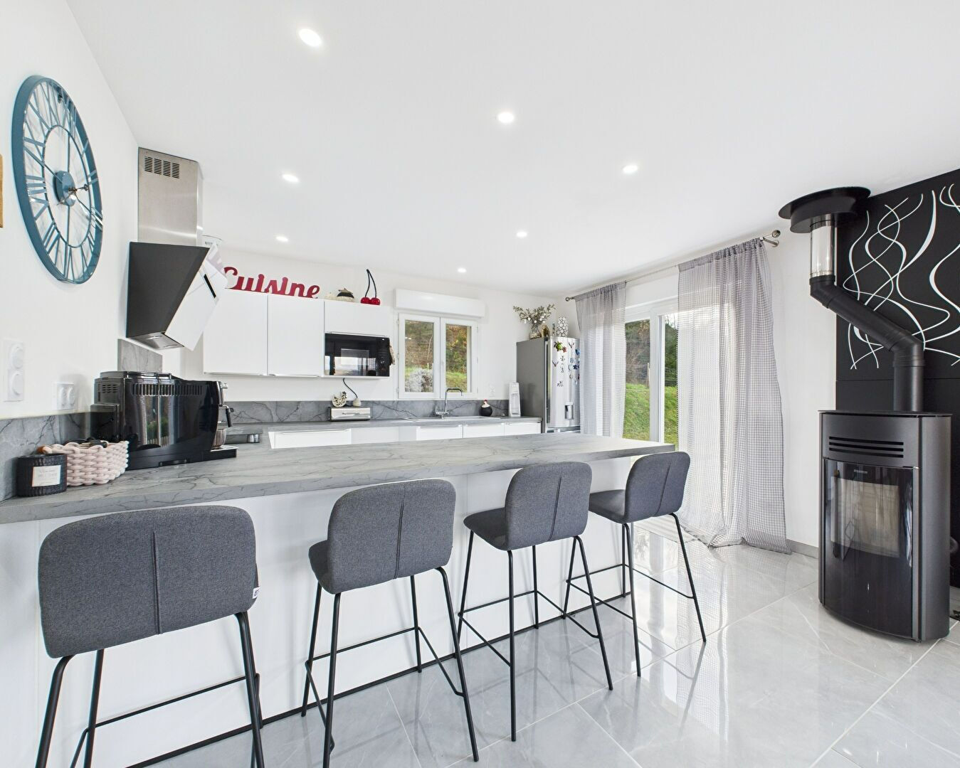 La pièce de vie, baignée de lumière, s'ouvre sur une cuisine aménagée et un séjour chaleureux animé par un poêle à granulés (programmable).