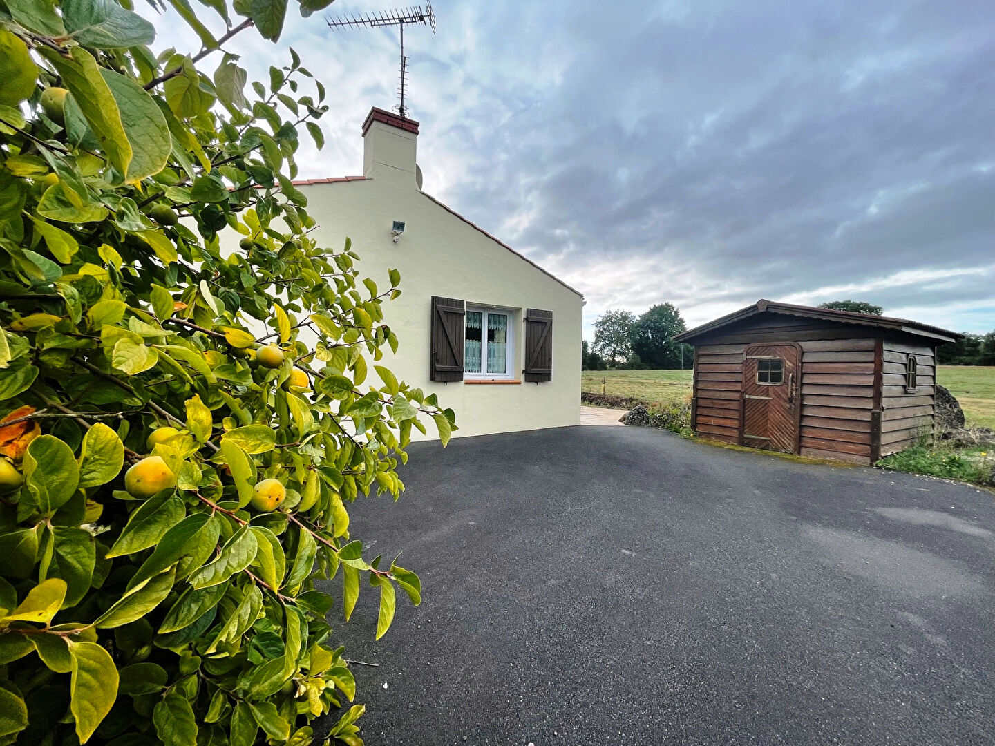 Le terrain d'environ 1500 m², non constructible, s'ouvre sur une vue dégagée sur les prés. À l'extérieur, un grand espace goudronné permet le stationnement de plusieurs véhicules et un abri de jardin offre un espace supplémentaire pour du rangement ou un atelier. La propriété est entièrement clôturée et dispose d'un portail.