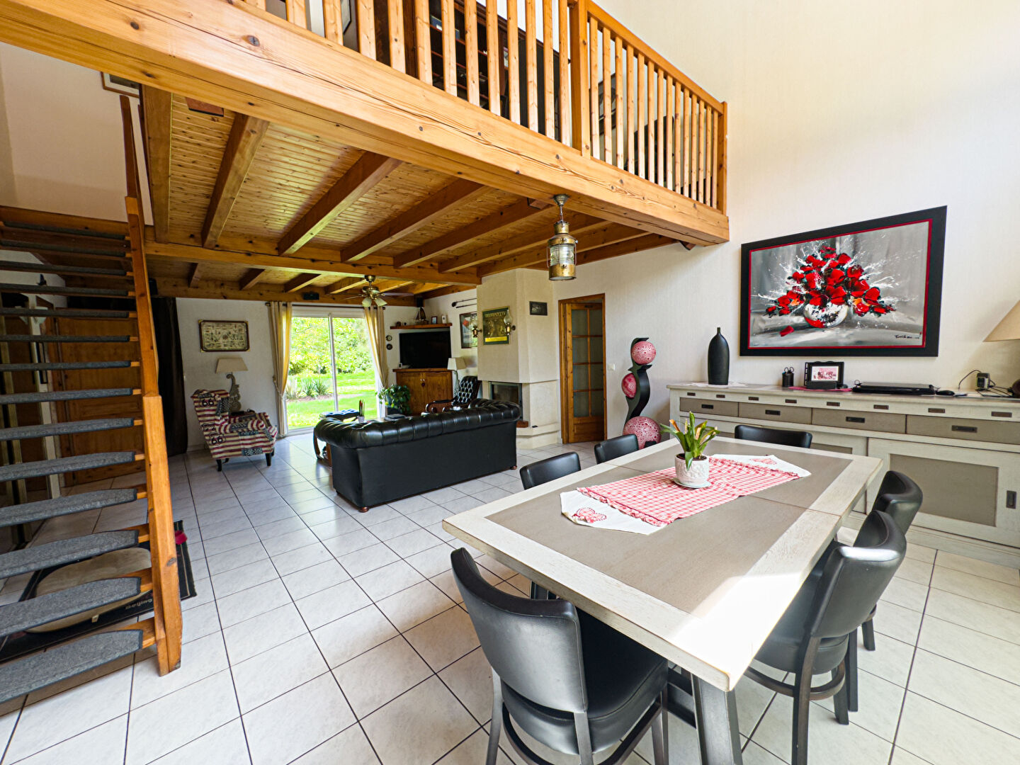 Caractéristiques principales : 195 m² habitables comprenant: 5 chambres spacieuses dont une avec dressing, une cuisine aménagée-équipée ouverte sur un grand salon lumineux avec une cheminée insert, une mezzanine avec un bureau, une chambre avec salle d'eau et WC, une arrière cuisine, un dégagement, une salle de bain , 2 WC, une chambre indépendante avec salle d'eau WC , une grande chaufferie, une terrasse avec un préau , un sauna avec douche un grand garage indépendant de 150 m².