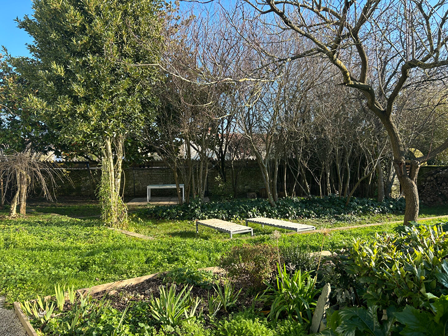La parcelle de jardin, d'environ 2 500 m², est aménagée en plusieurs espaces distincts, offrant un cadre extérieur à la fois fonctionnel et agréable. Le côté Est est dédié à un espace détente, tandis que le côté Ouest accueille un espace réservé aux animaux, entièrement clôturé, ainsi qu'un potager.