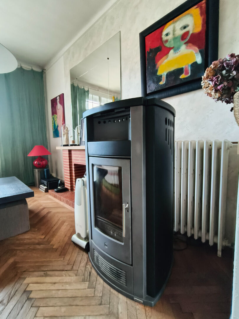 La cuisine et la pièce de vie se situent au premier étage. Traversant et baigné de lumière, le salon-séjour offre un parquet en chevron , un poêle à granulés et un accès direct au jardin.