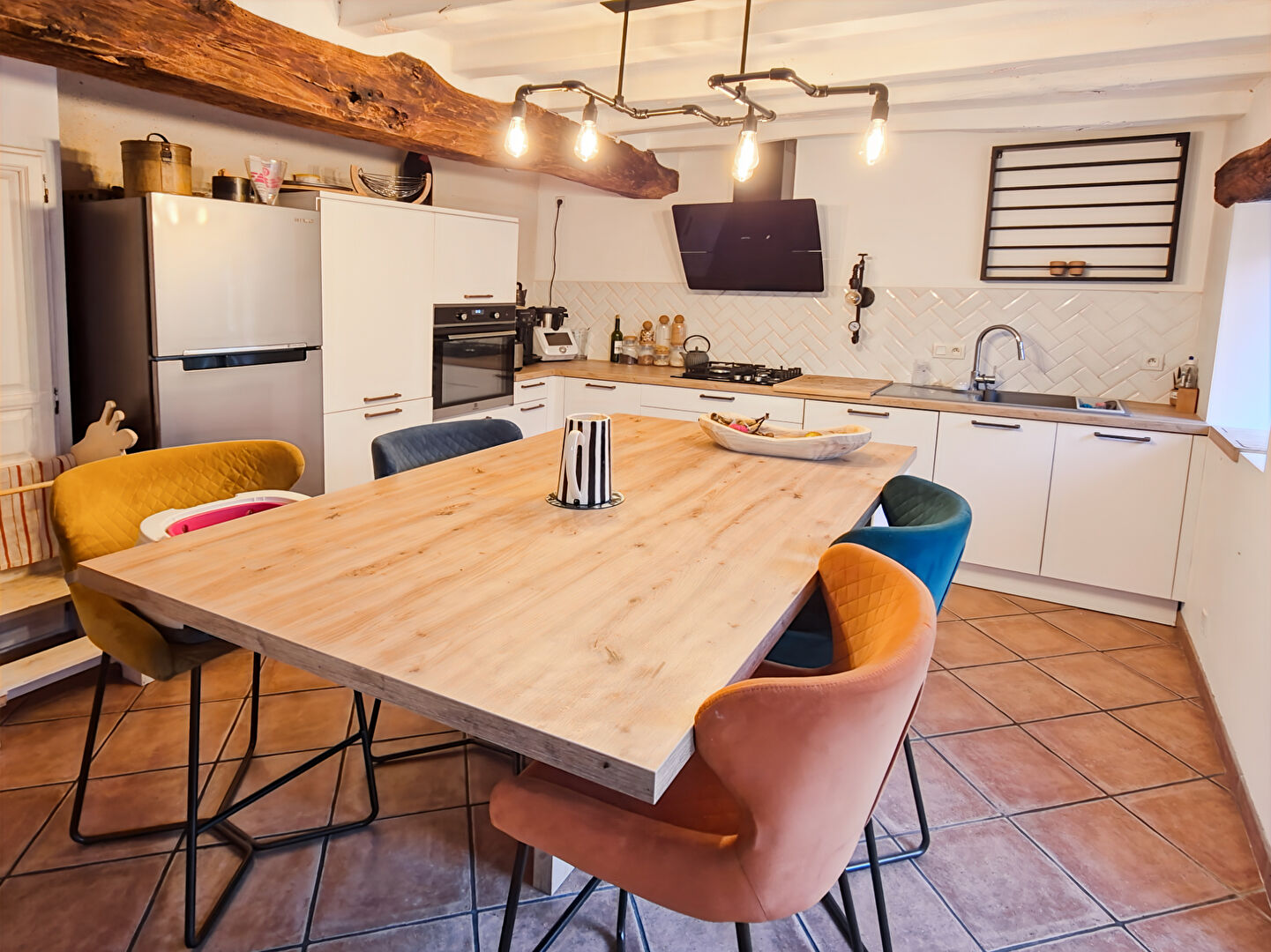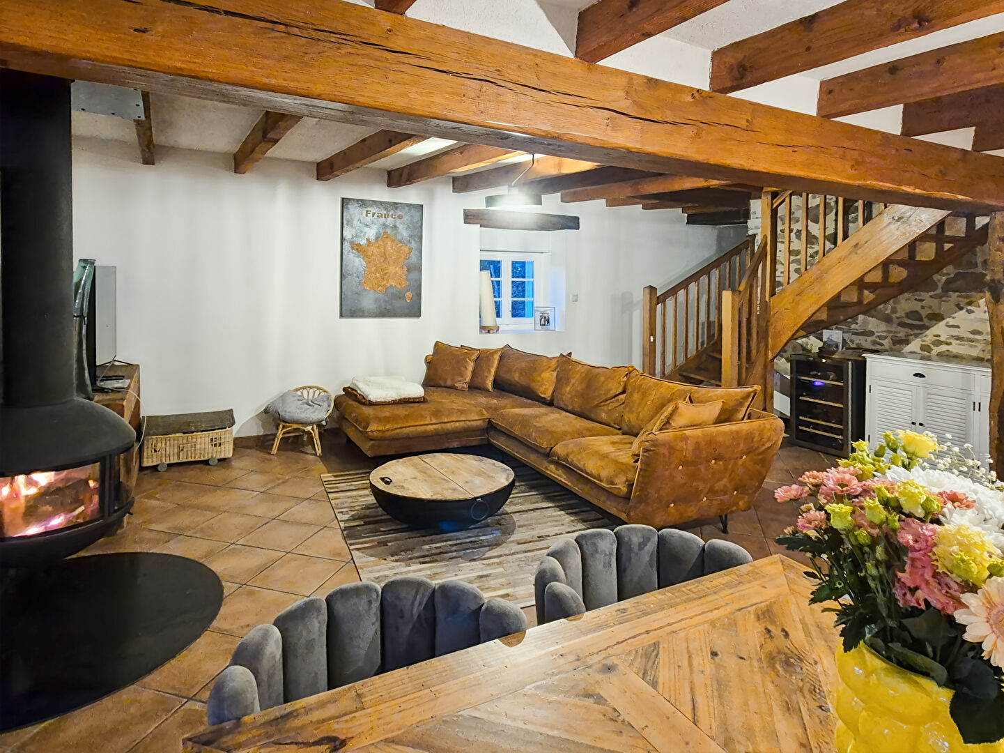 Elle offre une belle pièce de vie avec poêle à bois, idéale pour vos soirées cocooning, ainsi qu'une cuisine aménagée et équipée (meubles, hotte, four, lave-vaisselle, plaques gaz,) alliant fonctionnalité et esthétisme.