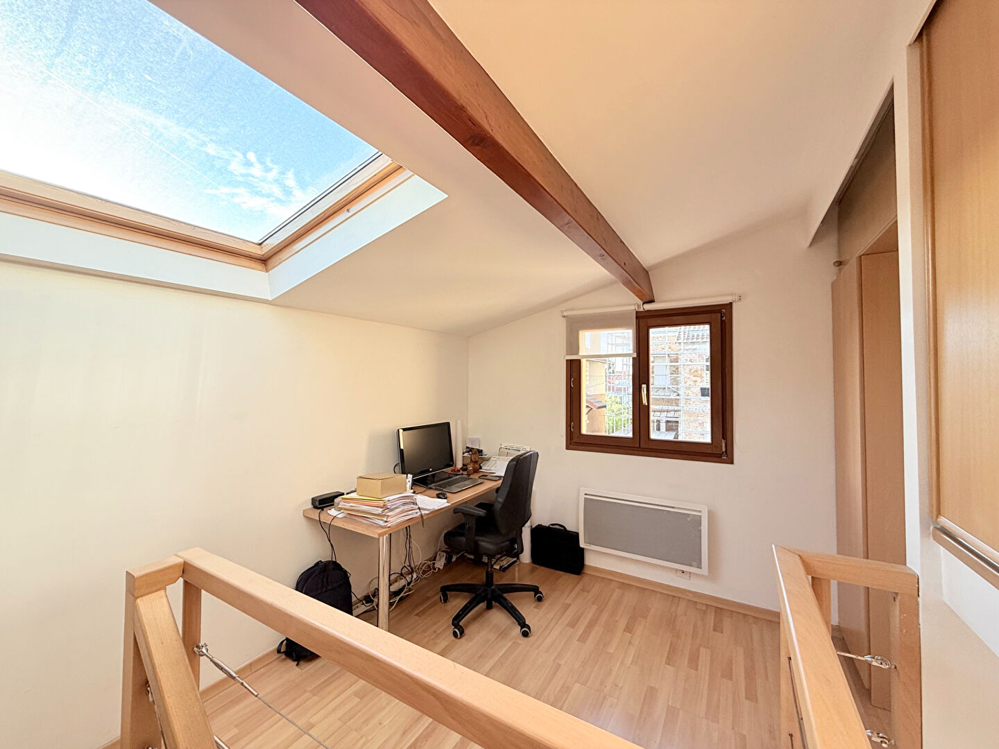 À l'étage, vous découvrirez un espace bureau baigné de lumière, ainsi que deux chambres, dont une chambre parentale avec dressing.