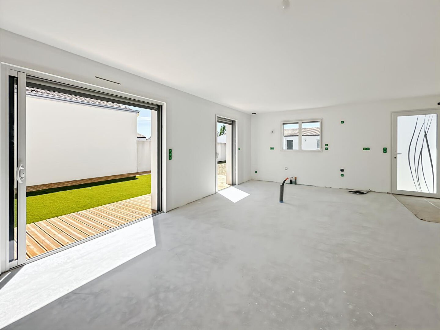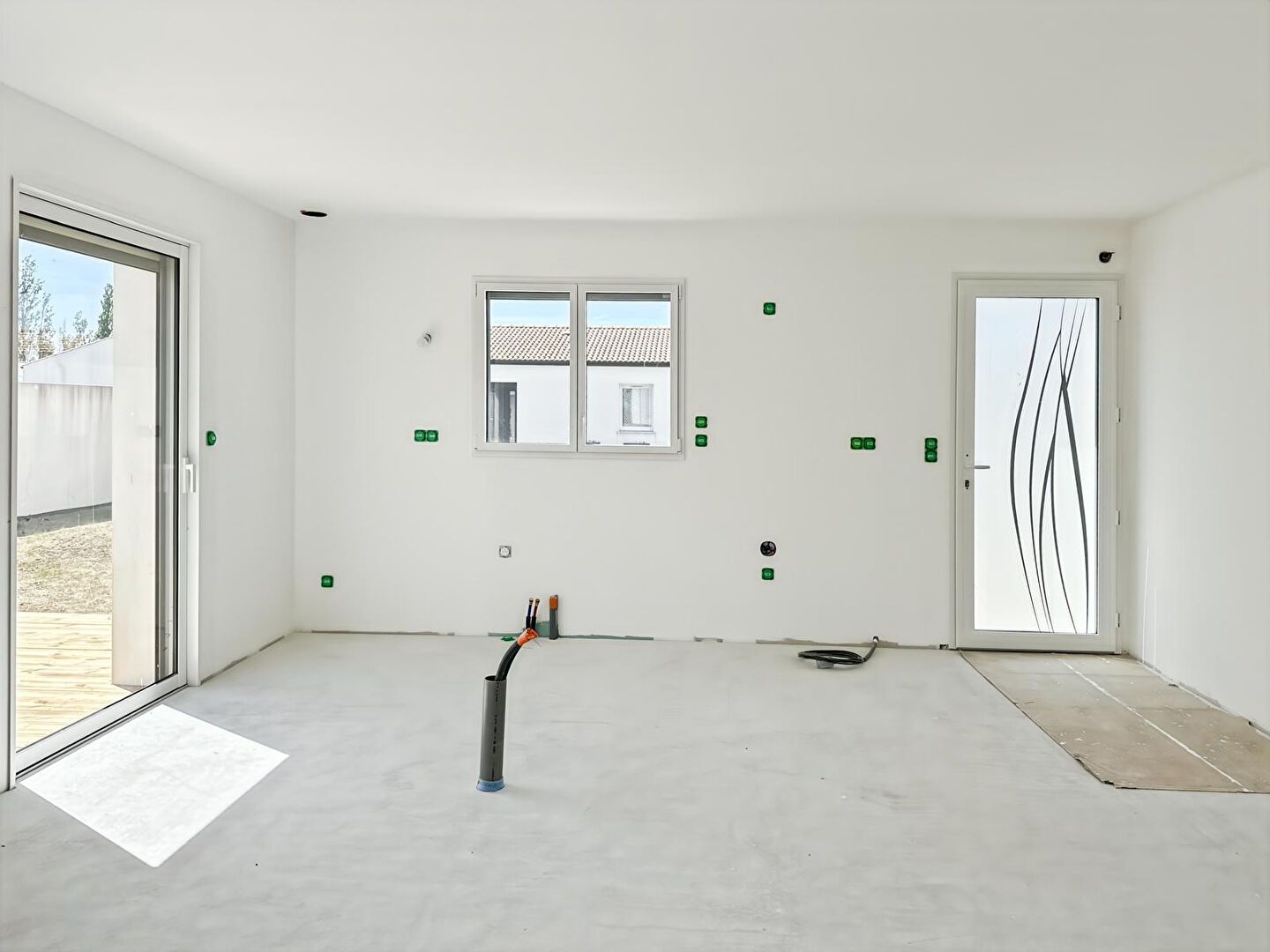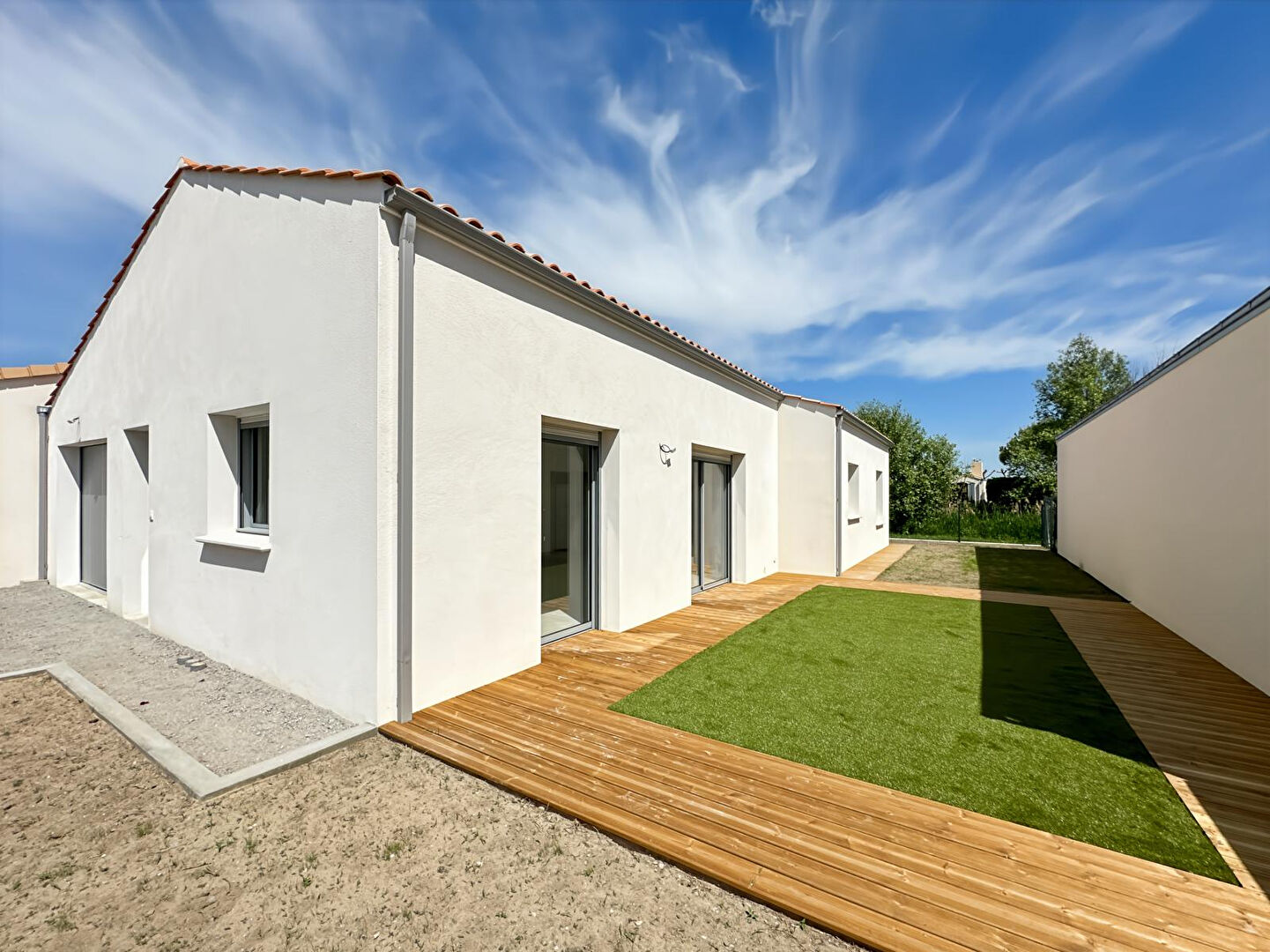 A VENDRE - LE PERRIER - Maison neuve de bonne construction aux normes RT2012 et PMR située à 800 mètres des commerces et 8 kilomètres de l'océan. Découvrez cette maison aux volumes confortables comprenant une pièce de vie baignée de lumière et ouverte sur l'extérieur par deux baies à galandage donnant sur une terrasse en bois avec un espace détente. Cuisine à aménager avec ilot central possible. Chauffage au sol et production d'eau chaude par pompe à chaleur, volets roulants électriques, murs de clôtures effectués et attentes pour portail électrique. Ce bien dispose de 3 chambres avec placards, une salle d'eau, un WC indépendant avec lave-mains, un bureau, un local technique, et un grand garage avec porte sectionnelle motorisée. Grenier. Les revêtements de sols sont à prévoir, ainsi que l'aménagement de la cuisine, du toilette et de la salle d'eau.