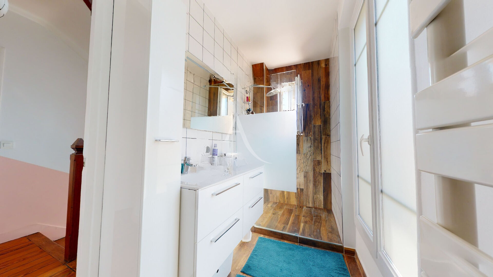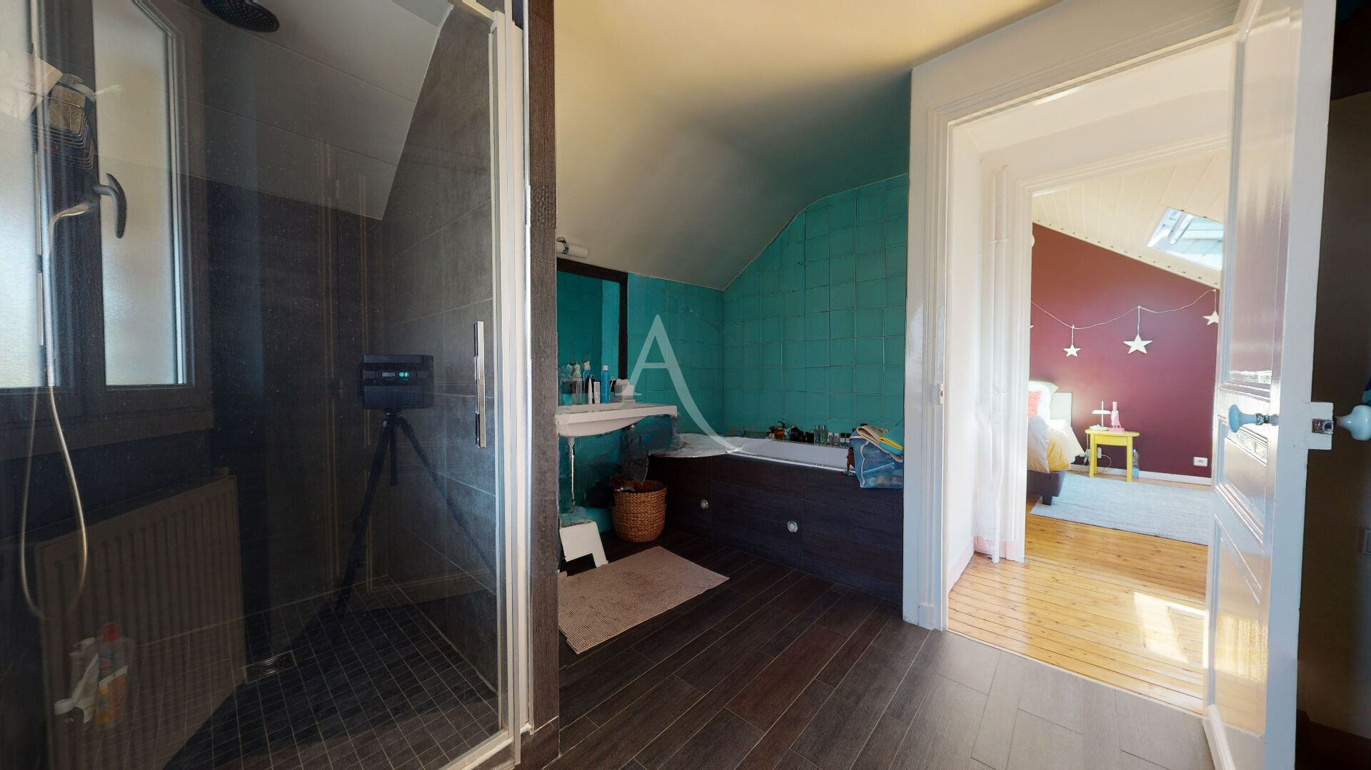 L'escalier en bois ciré poursuit sa course jusqu'au 3ème niveau, occupé entièrement par une suite parentale, semi mansardée ( sans aucune gêne pour l'habitabilité) avec salle de bain complète, douche et baignoire.