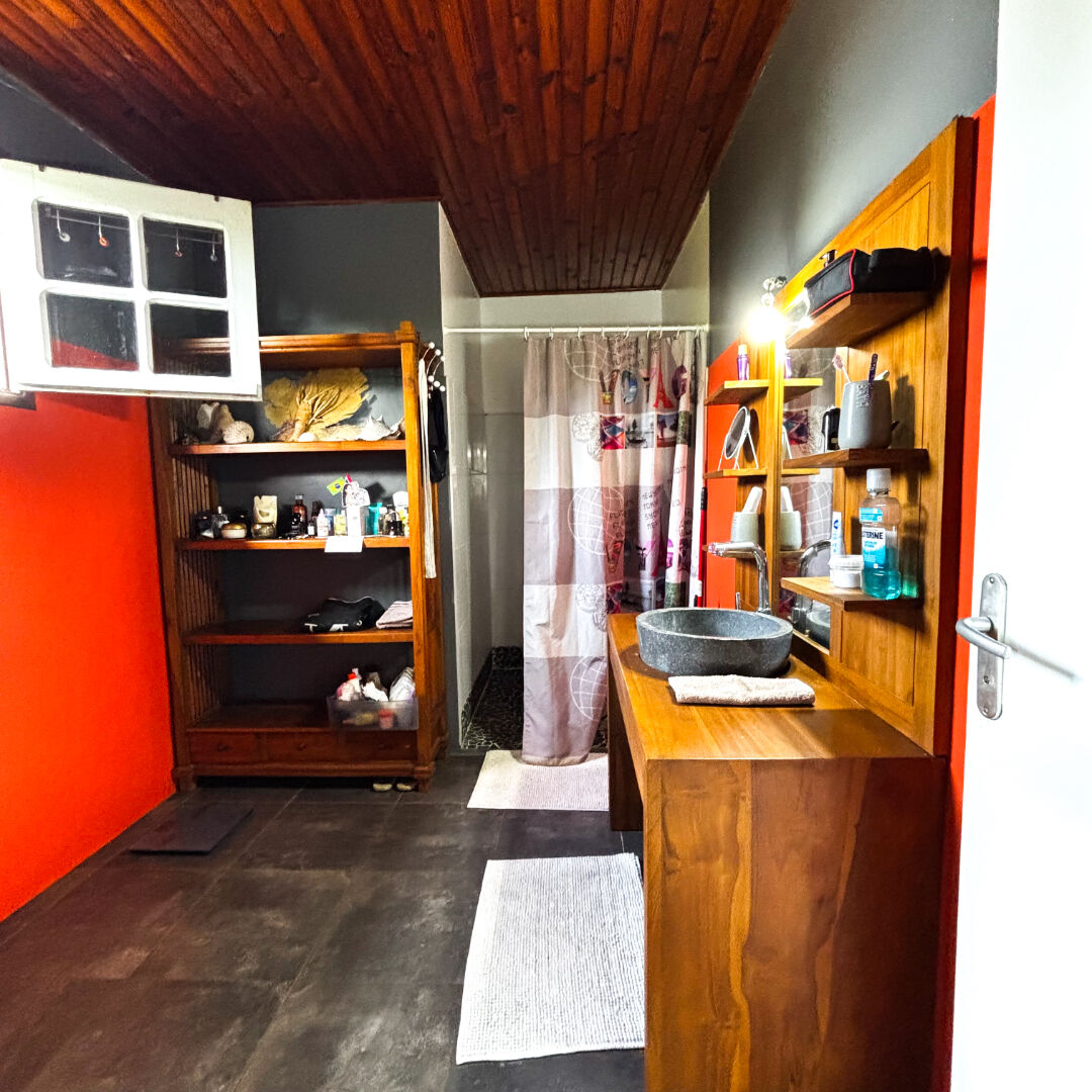 Au Robert, dans un quartier calme et verdoyant, cette maison T4 avec piscine offre une vue mer dégagée et un jardin tropical arboré. La maison principale comprend trois chambres climatisées dont une suite parentale, un séjour lumineux, une cuisine avec cellier, une seconde salle d'eau, un WC indépendant et une terrasse orientée sud-est bordée de la piscine au sel avec deck.