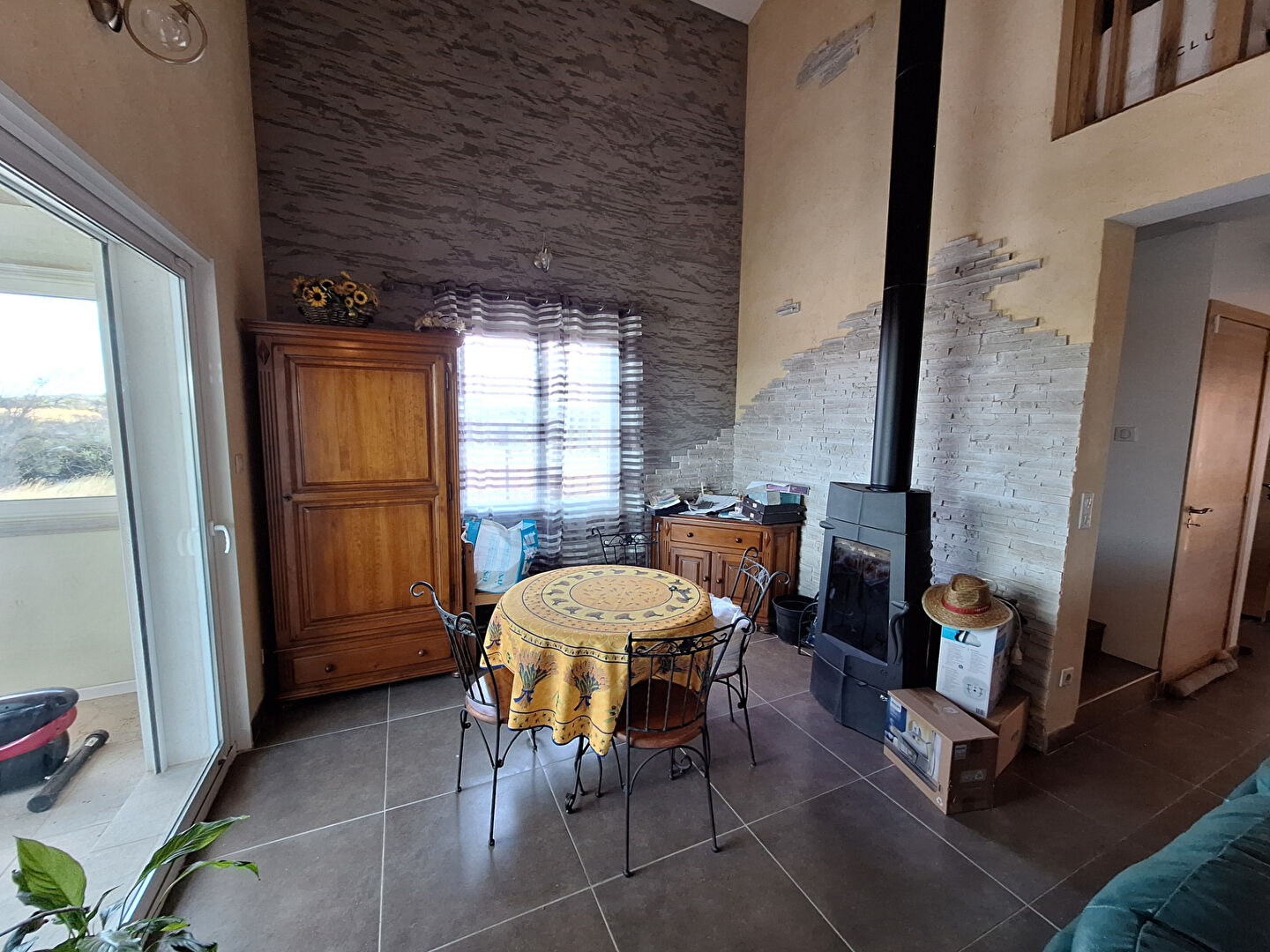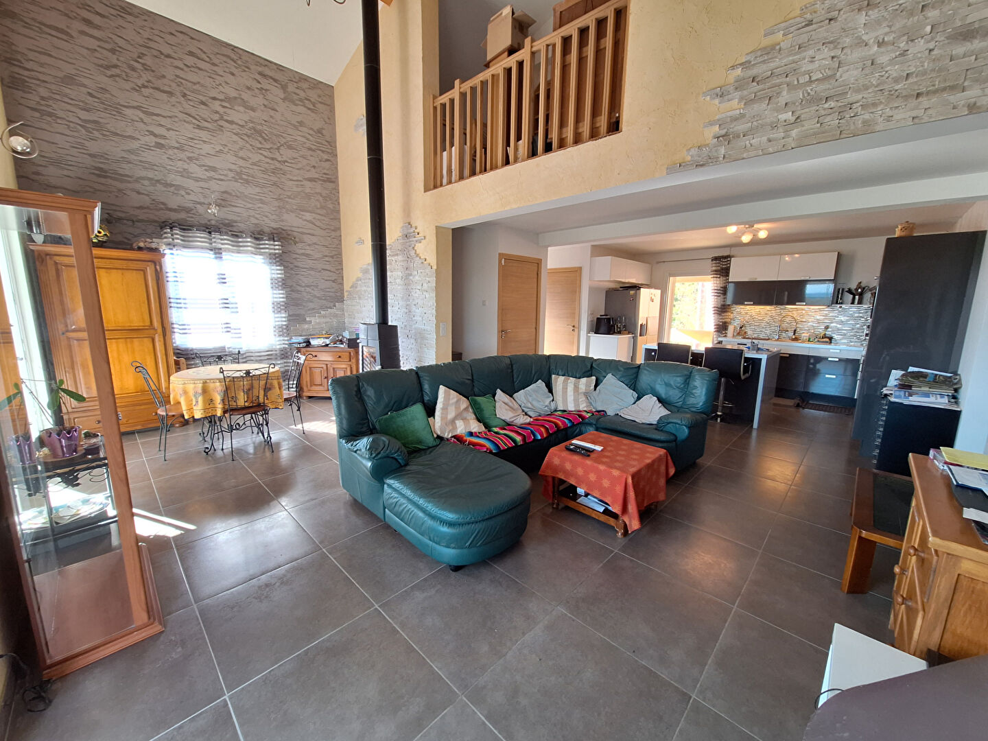 . Un grand salon salle à manger avec un poêle à bois