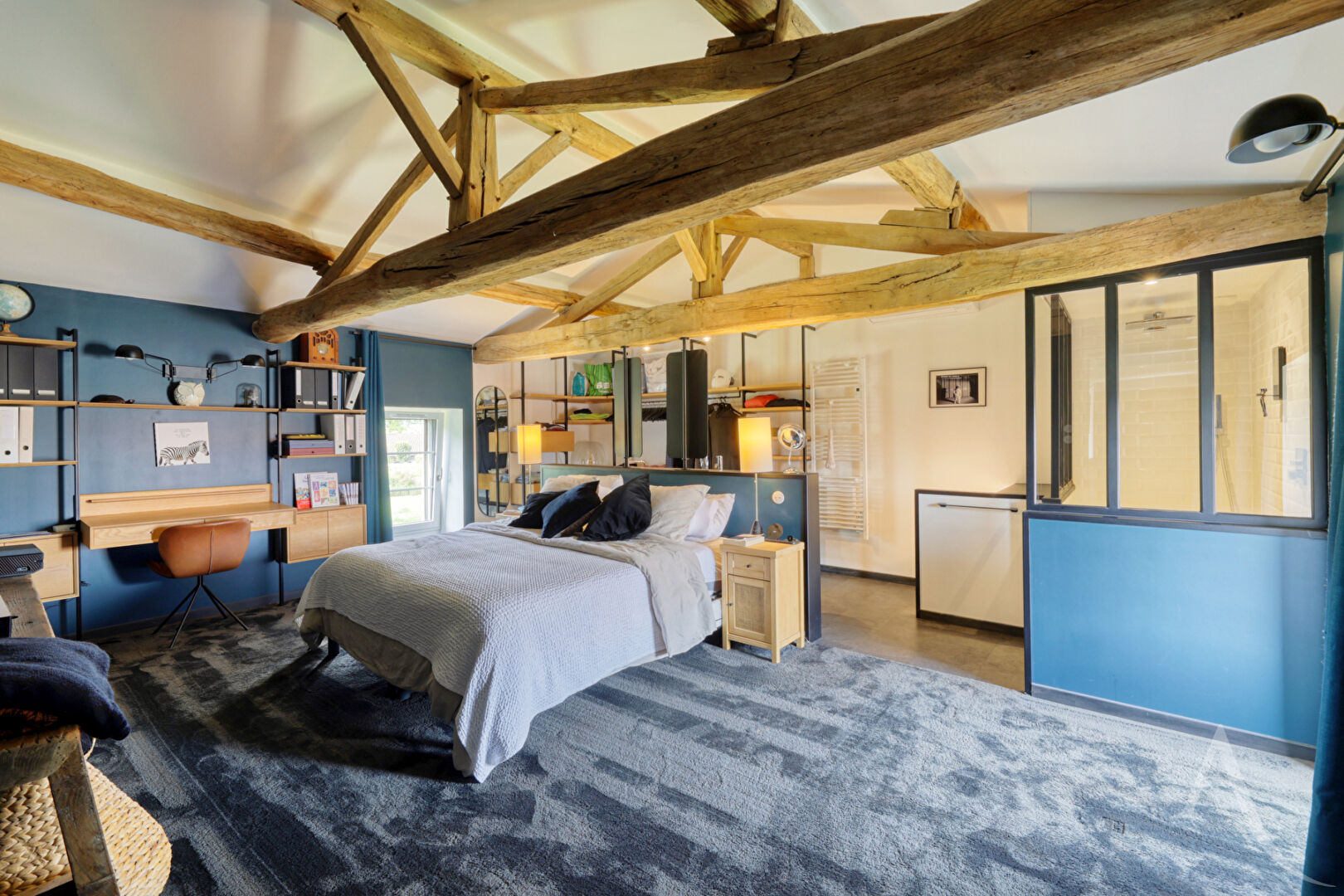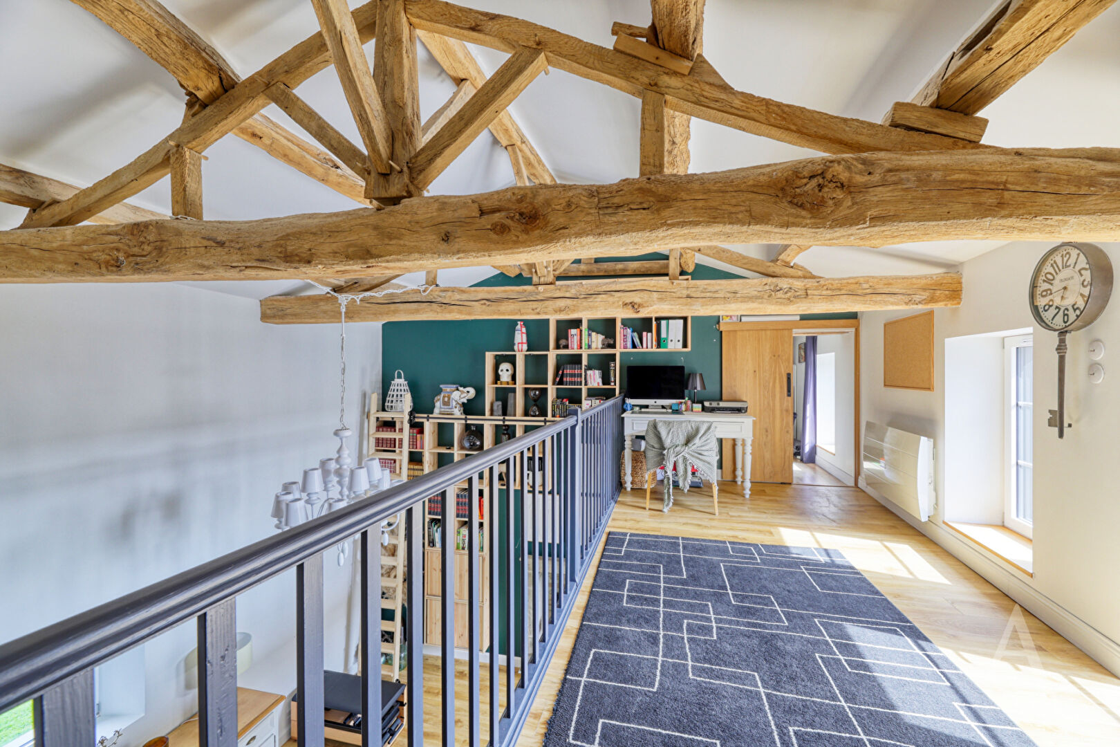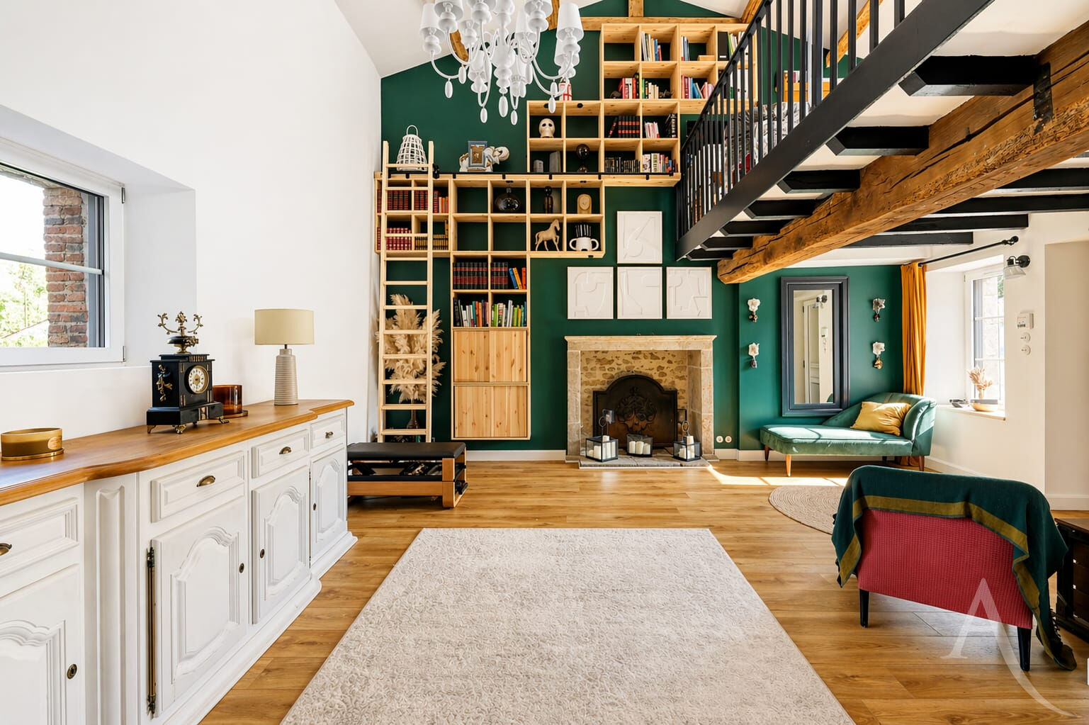 Dès l'entrée, le ton est donné : un espace à part entière, sublimé par une hauteur sous plafond remarquable, une mezzanine ouverte et une superbe bibliothèque sur mesure encadrant une cheminée pleine de caractère. Un lieu chaleureux, baigné de lumière, qui offre immédiatement une atmosphère unique et authentique.