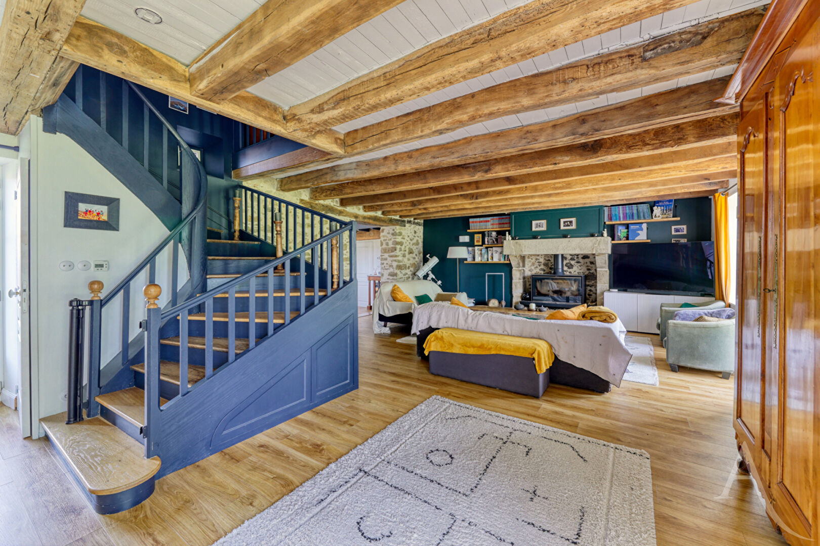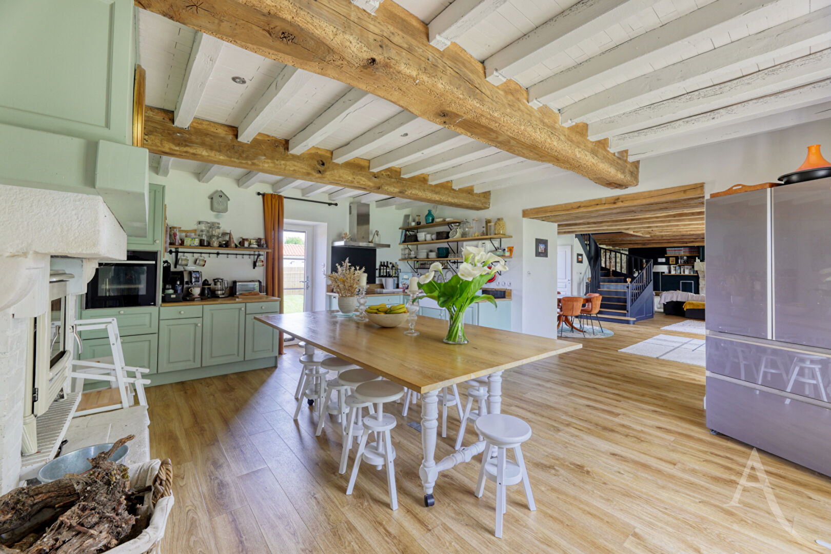 Dans le prolongement, la maison dévoile un vaste espace de vie de plus de 80 m² comprenant salon, séjour et cuisine. Les volumes, les matériaux nobles et la présence de deux poêles à bois créent un cadre de vie à la fois convivial et élégant. Le confort est également au rendez-vous grâce au plancher chauffant et aux panneaux solaires.