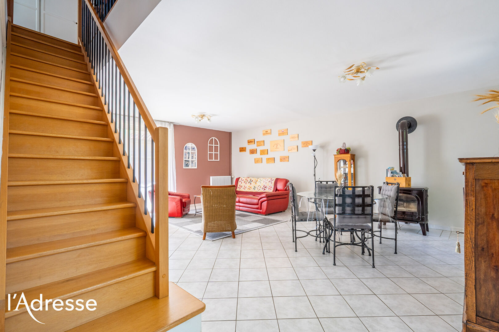 Rez-de-chaussée :Un vaste salon lumineux avec poêle à bois et grande baie vitrée (double vitrage)