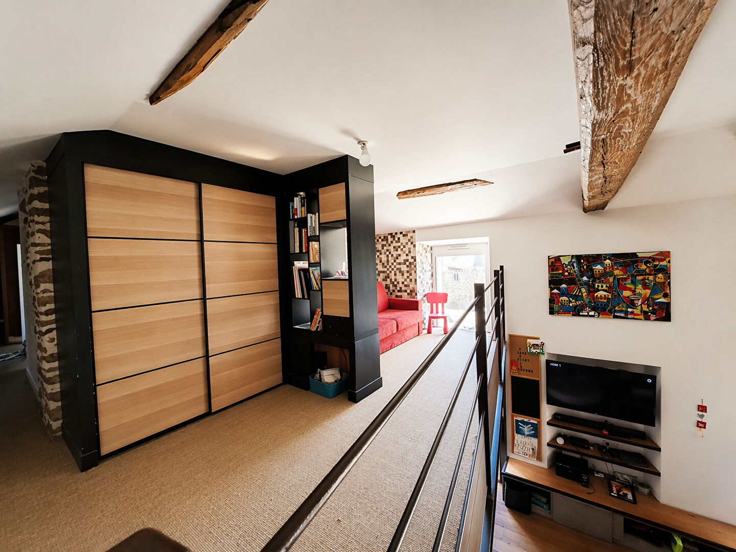 À l'étage, vous découvrez une mezzanine ouverte, deux chambres lumineuses, une salle de bain ainsi que des toilettes séparés, permettant une organisation fluide et adaptée à une vie de famille.
