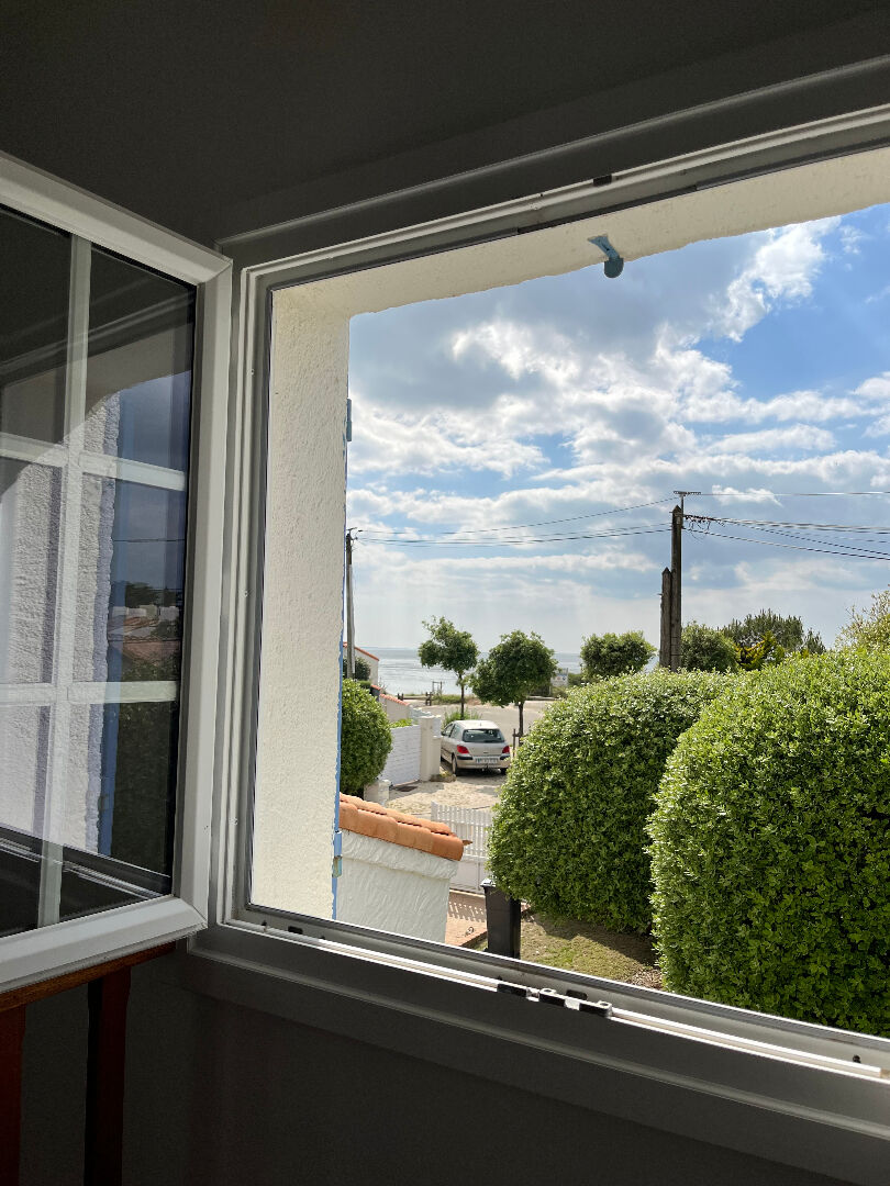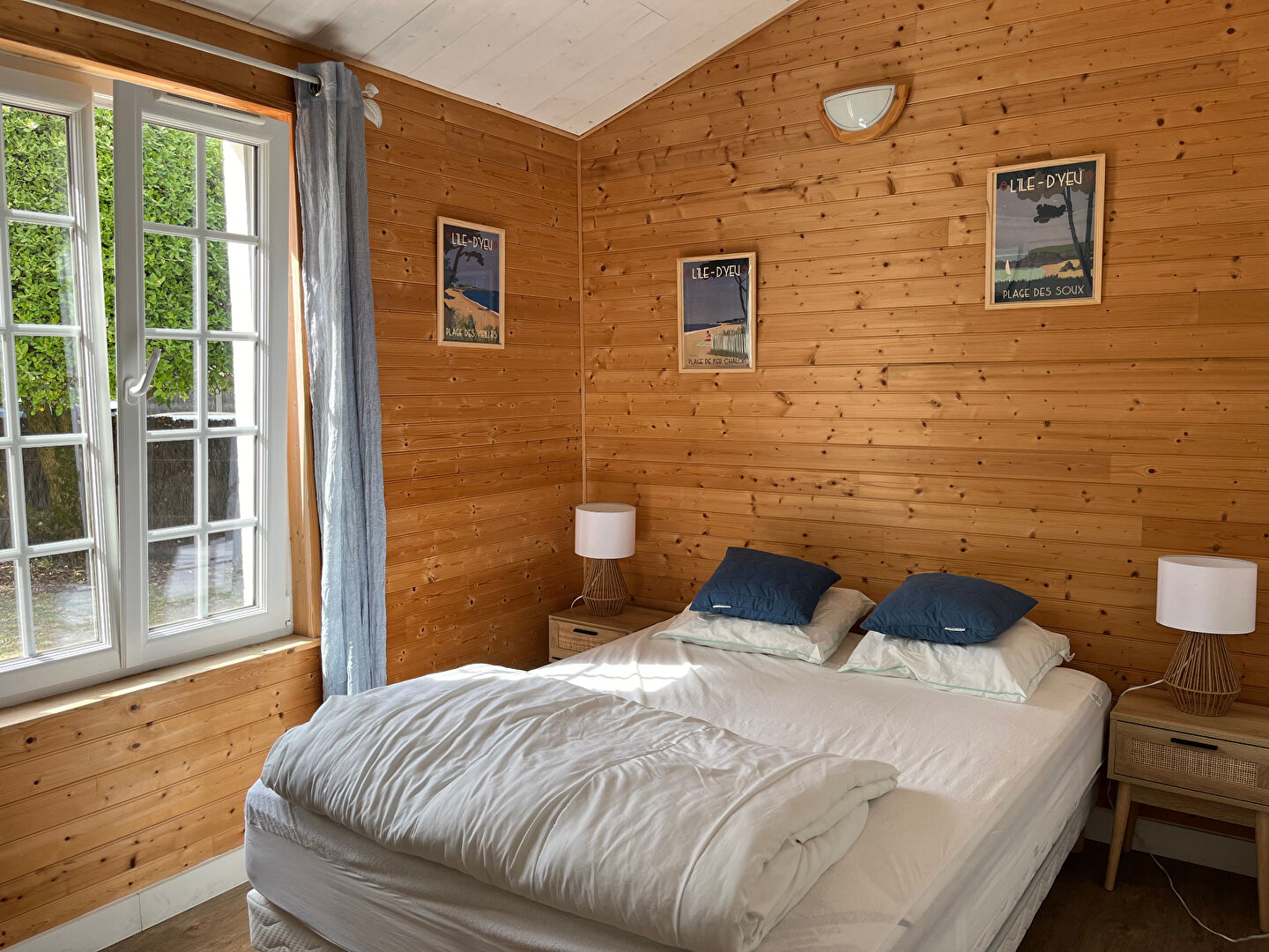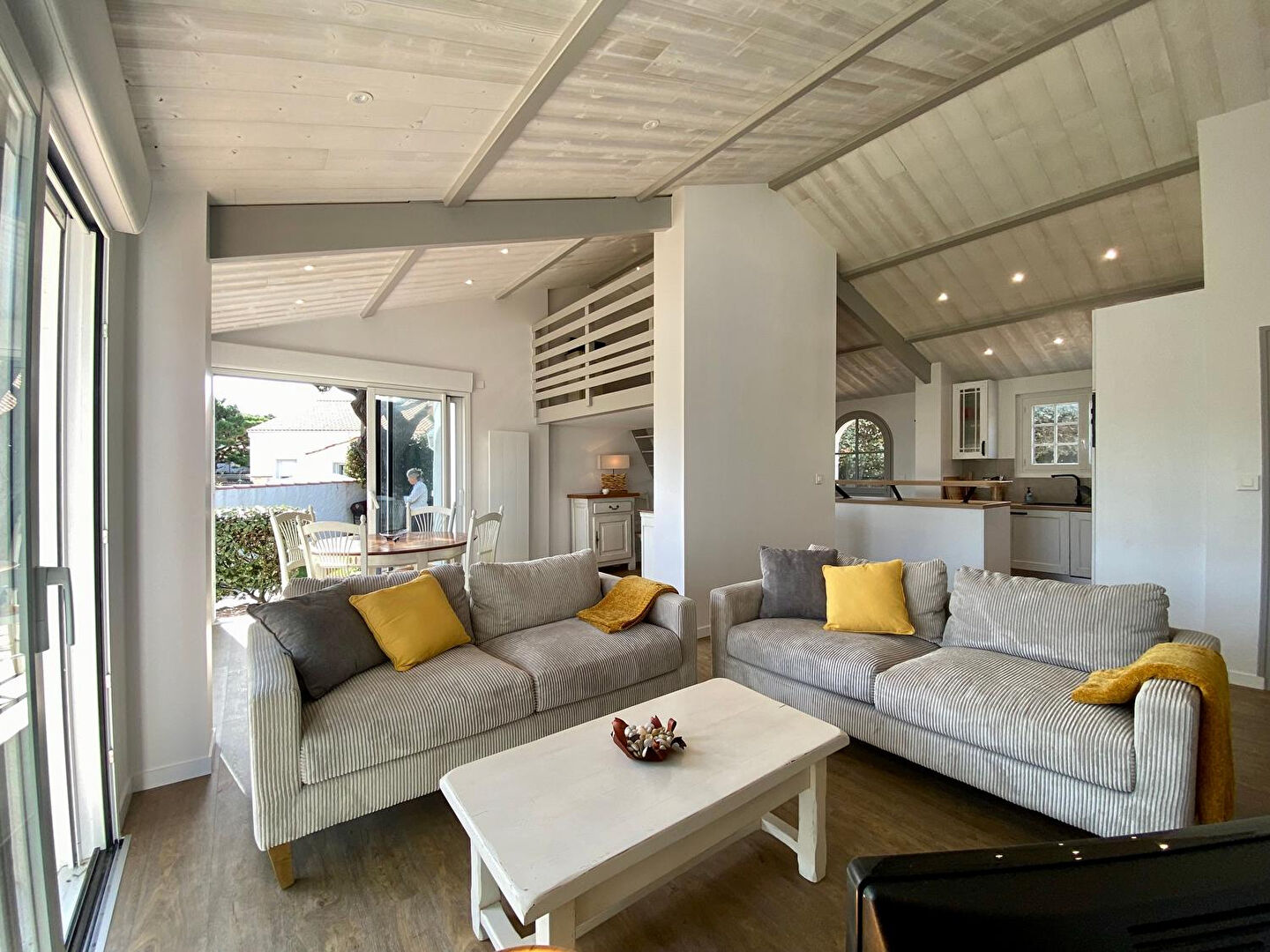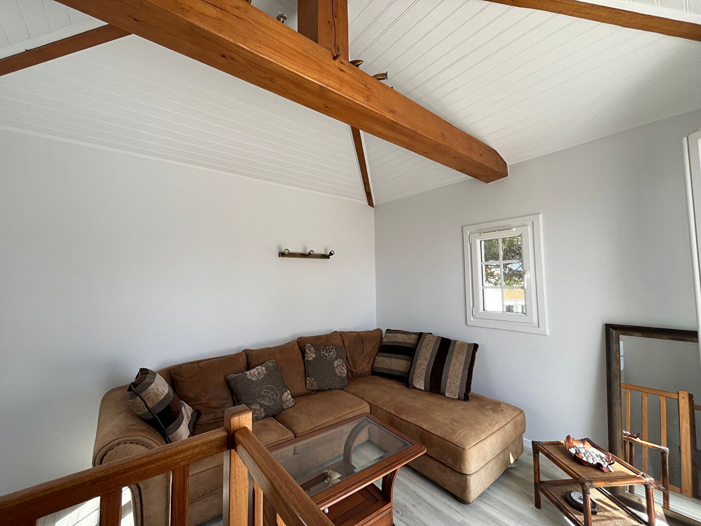 Idéalement située à 50m de la mer et à proximité des commerces du bourg des Moutiers, cette maison rénovée avec goût en 2022 offre : une pièce à vivre lumineuse et traversante avec poêle à pellets et cuisine aménagée et équipée, un bureau en mezzanine au dessus du séjour.