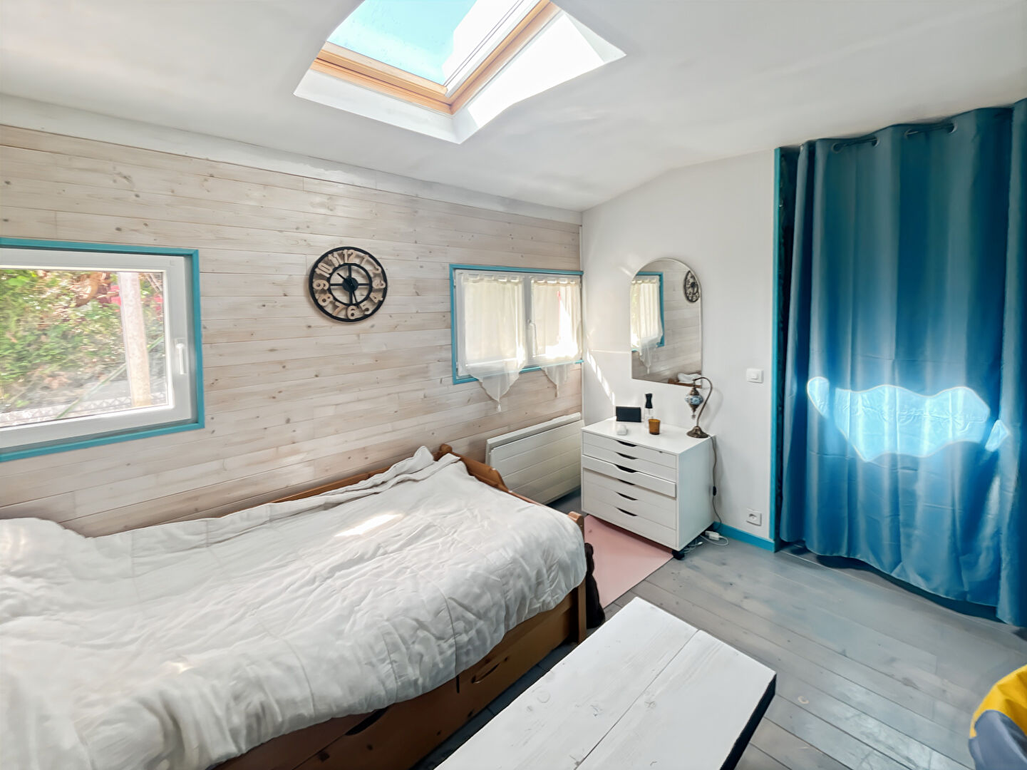 Edifiée sur une parcelle de 421 m², d'une superficie de 87 m², elle se compose d'une entrée, d'un salon lumineux ouvert sur une cuisine américaine équipée et meublée, d'un dégagement desservant une salle d'eau avec WC, d'une seconde entrée ouvrant sur le salon, de trois chambres au rez-de-chaussée, dont une avec pièce d'eau privative.