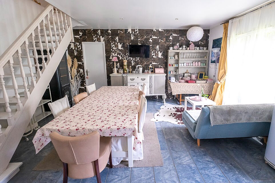 Longère d'environ 236m² habitables disposant de deux entrées distinctes (l'une personnelle, l'autre pour la clientèle), un salon, une salle à manger, une grande cuisine aménagée et équipée, une chambre avec salle d'eau