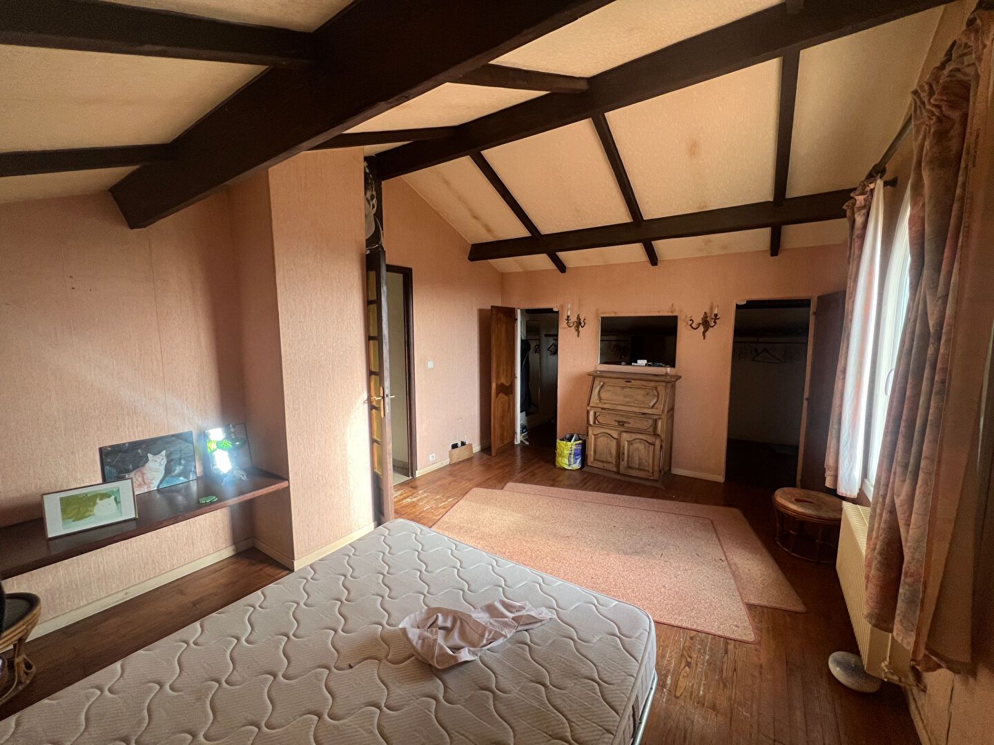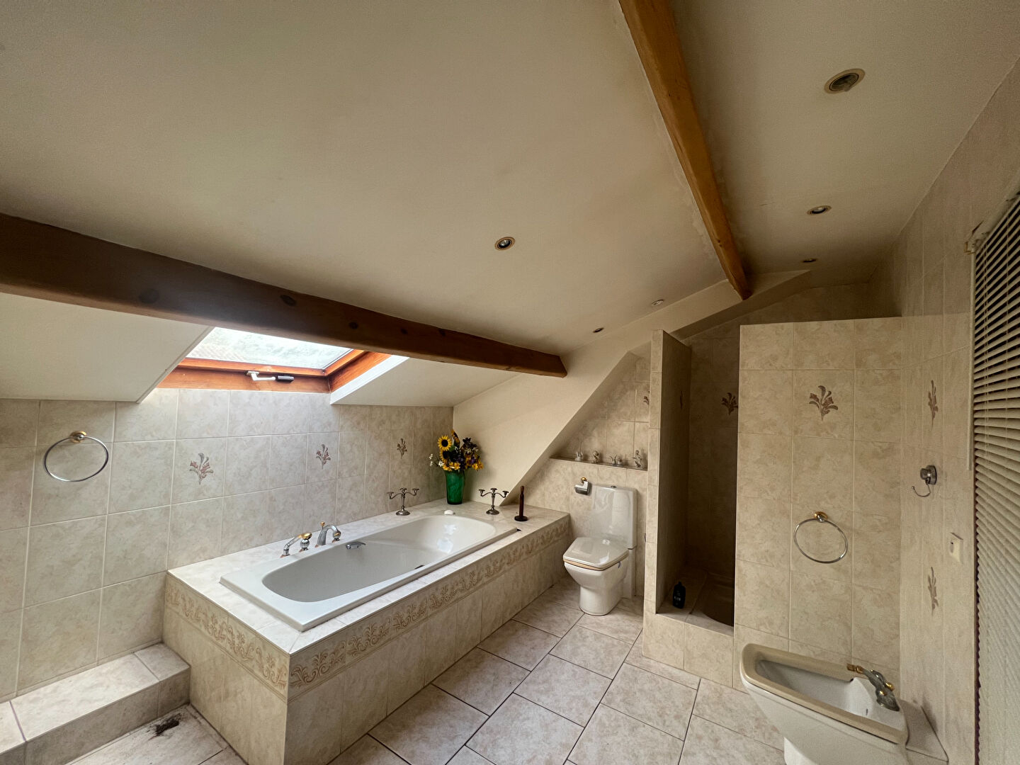 Au 2e étage : 2 chambres dont une avec dressing, un grand espace bureau ou chambre, et une salle de bains avec baignoire, douche et WC.