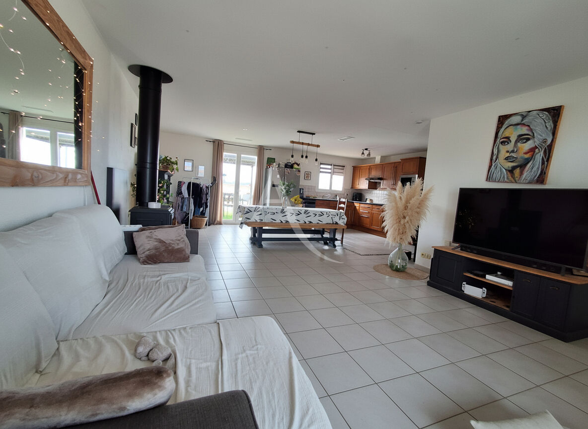 Coup de coeur pour la pièce de vie très lumineuse et spacieuse de 56 m2 avec cuisine équipée.