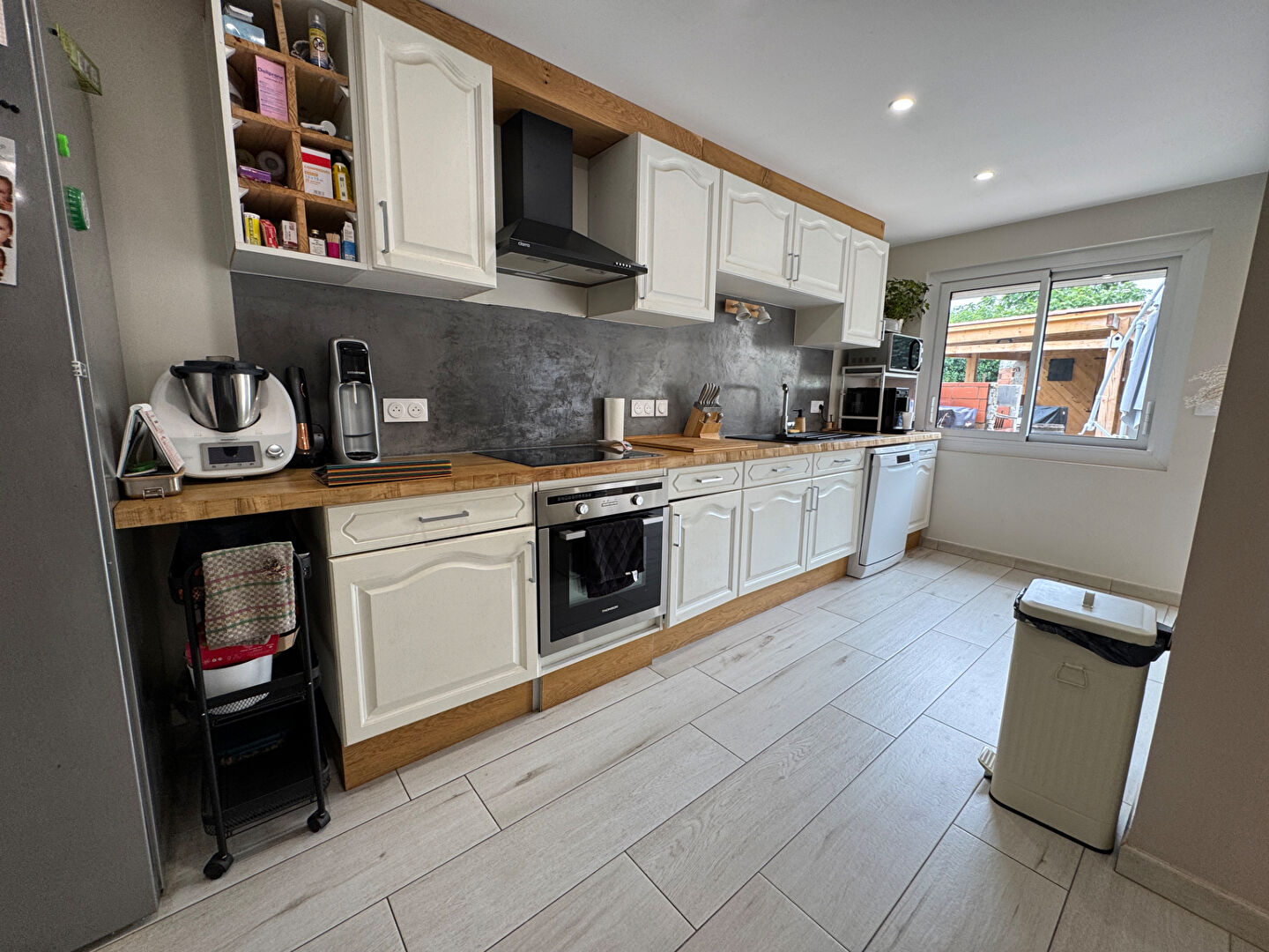 - Cuisine équipée : hotte, plaque induction, four électrique