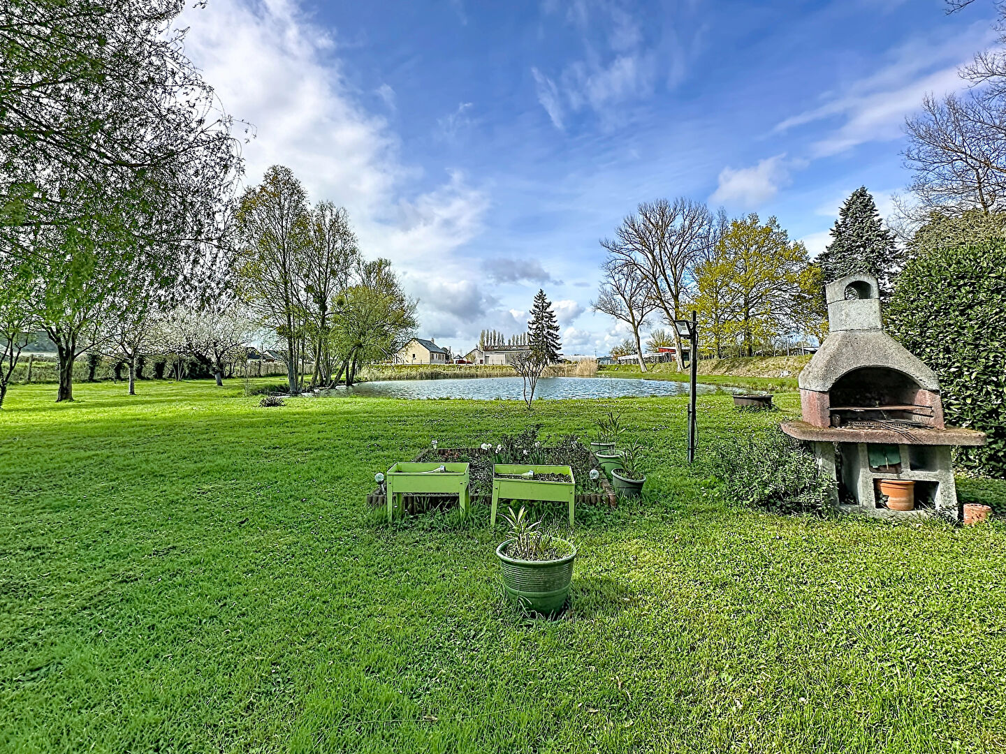 Le terrain, d'une superficie généreuse, offre un cadre bucolique et apaisant. L'étang, véritable pièce maîtresse de la propriété, apporte charme et sérénité. Que ce soit pour observer la nature, se ressourcer ou simplement profiter du calme environnant, cet espace extérieur est une invitation à la détente.