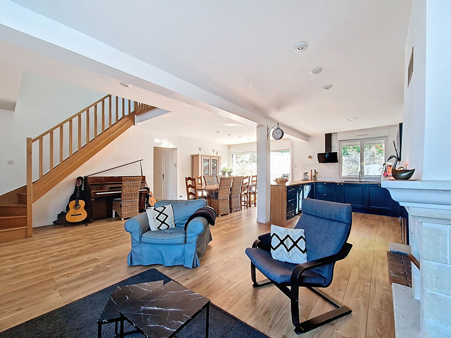 Dès l'entrée, la vaste pièce de vie de 57m² séduit par sa clarté et sa cheminée insert qui apporte une atmosphère chaleureuse. La cuisine, aménagée et entièrement équipée, s'intègre harmonieusement à l'ensemble. Une grande salle de douche faisant également office de buanderie, une belle chambre, un WC indépendant et un garage complètent ce niveau.