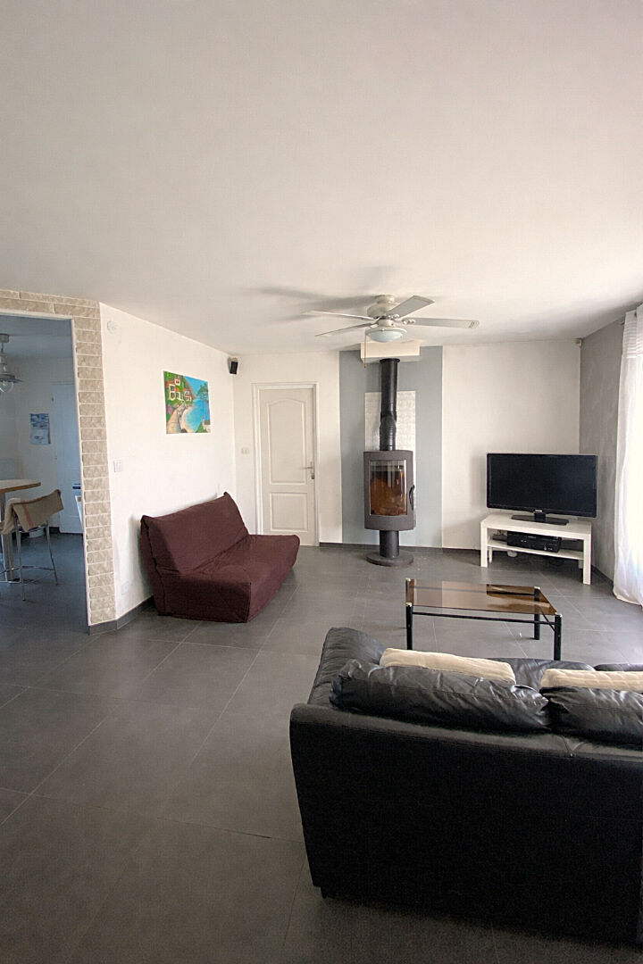 Une pièce de vie avec poêle à bois, une cuisine aménagée et équipée avec cellier, 3 chambres en rez-de-chaussée avec une salle de bains et un bureau.