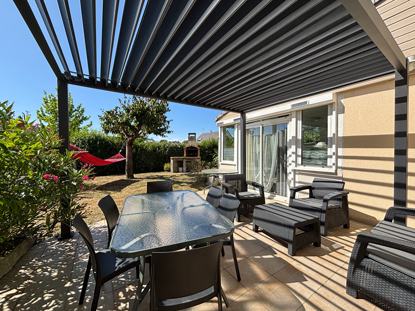 Une terrasse avec pergola est accessible de plain pied par le salon et la chambre. Un bassin à poissons, un cabanon, un bucher, un atelier et un carport complètent ce bien.