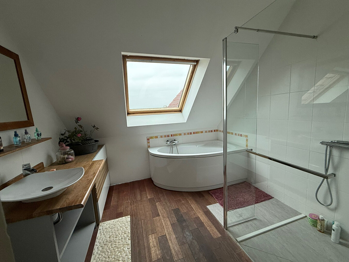À l'étage, un large palier distribue 3 chambres, une salle de bains avec meuble vasque, douche italienne et baignoire, une salle de jeux adaptable selon vos besoins.