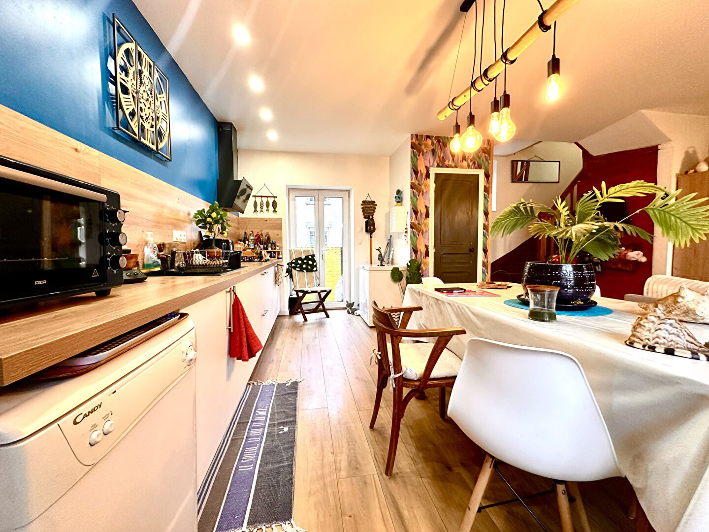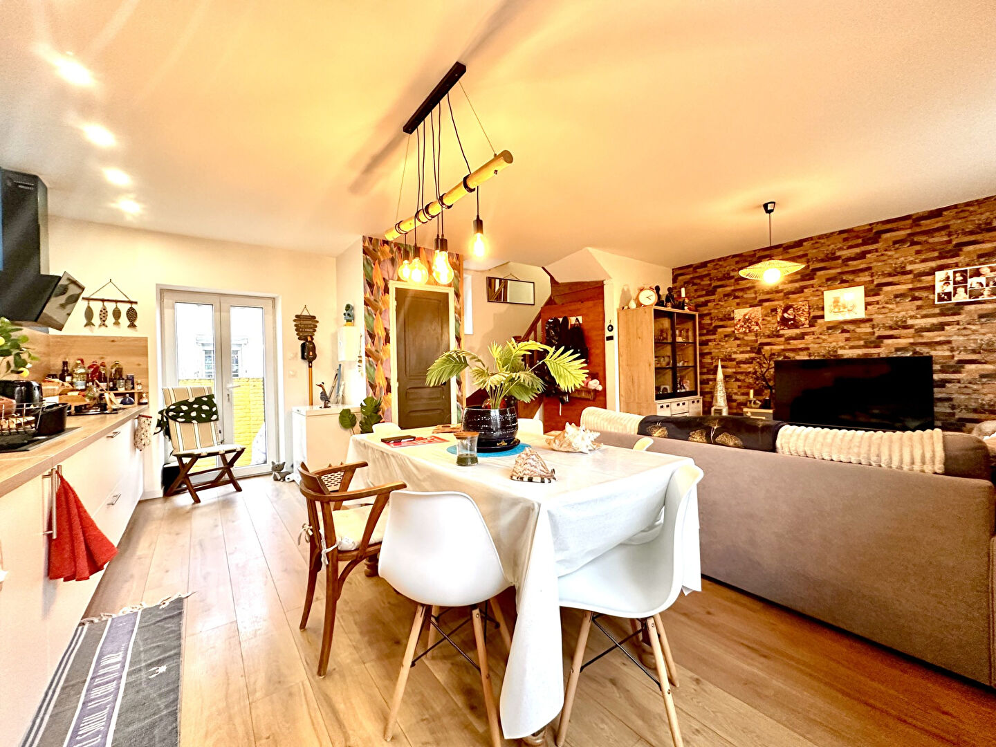 Au rez-de-chaussée, vous découvrirez une entrée, une cuisine équipée ouverte sur une pièce de vie ainsi qu'un WC indépendant.