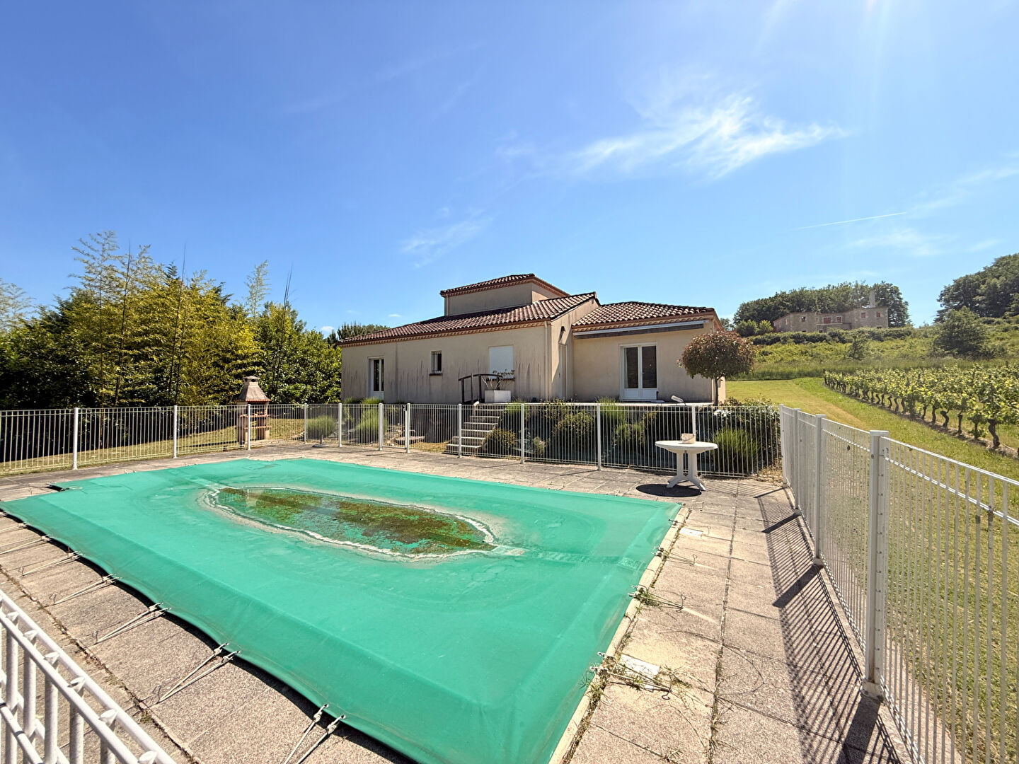 D'une superficie de 131 m2, elle comprend une entrée accueillante, un vaste séjour lumineux de 43 m2 donnant directement sur la piscine, une cuisine aménagée et équipée de 16 m2, deux chambres spacieuses (16 et 14 m2), une grande salle de bain avec baignoire et douche, ainsi qu'un toilette indépendant. Une troisième chambre avec sa propre salle d'eau et WC se trouve dans le pigeonnier.