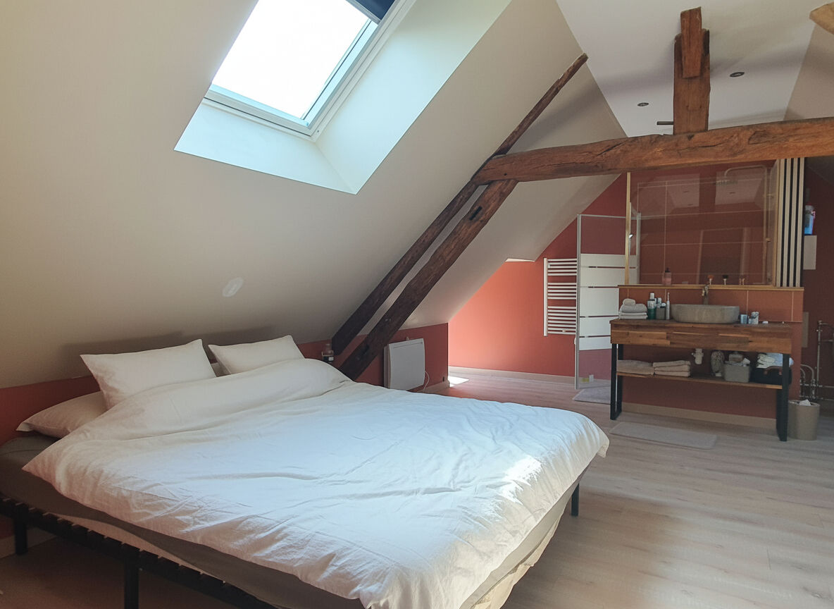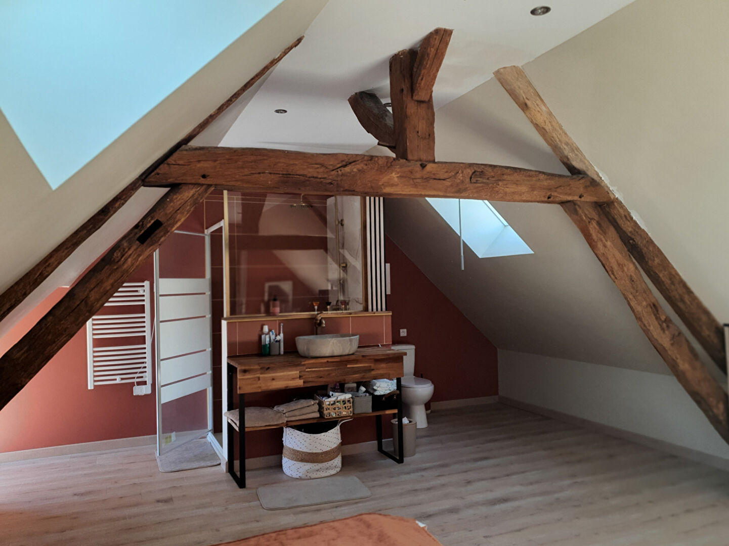 Étage : chambre avec salle de bains et wc, chambre avec salle d'eau et wc, chambre, palier.