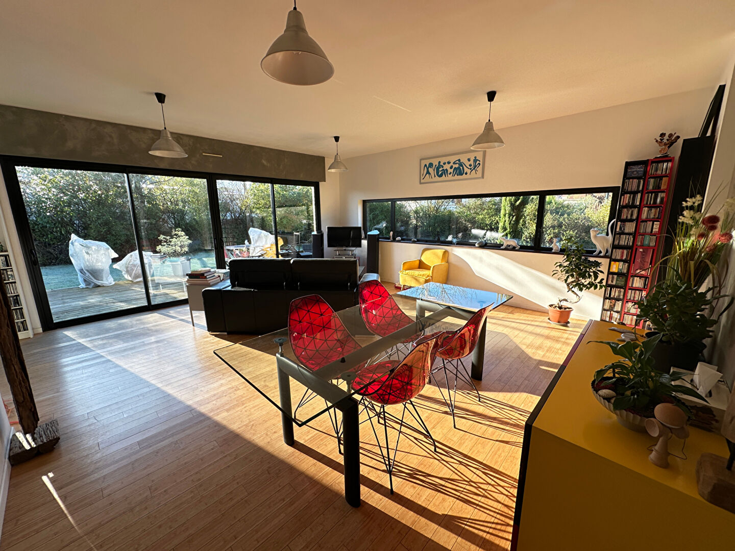 De plain pied, l'entrée s'ouvre sur la pièce de vie de presque 38 m², particulièrement lumineuse grâce à ses grandes ouvertures. La cuisine aménagée équipée a été refaite il y a un peu plus d'un an.