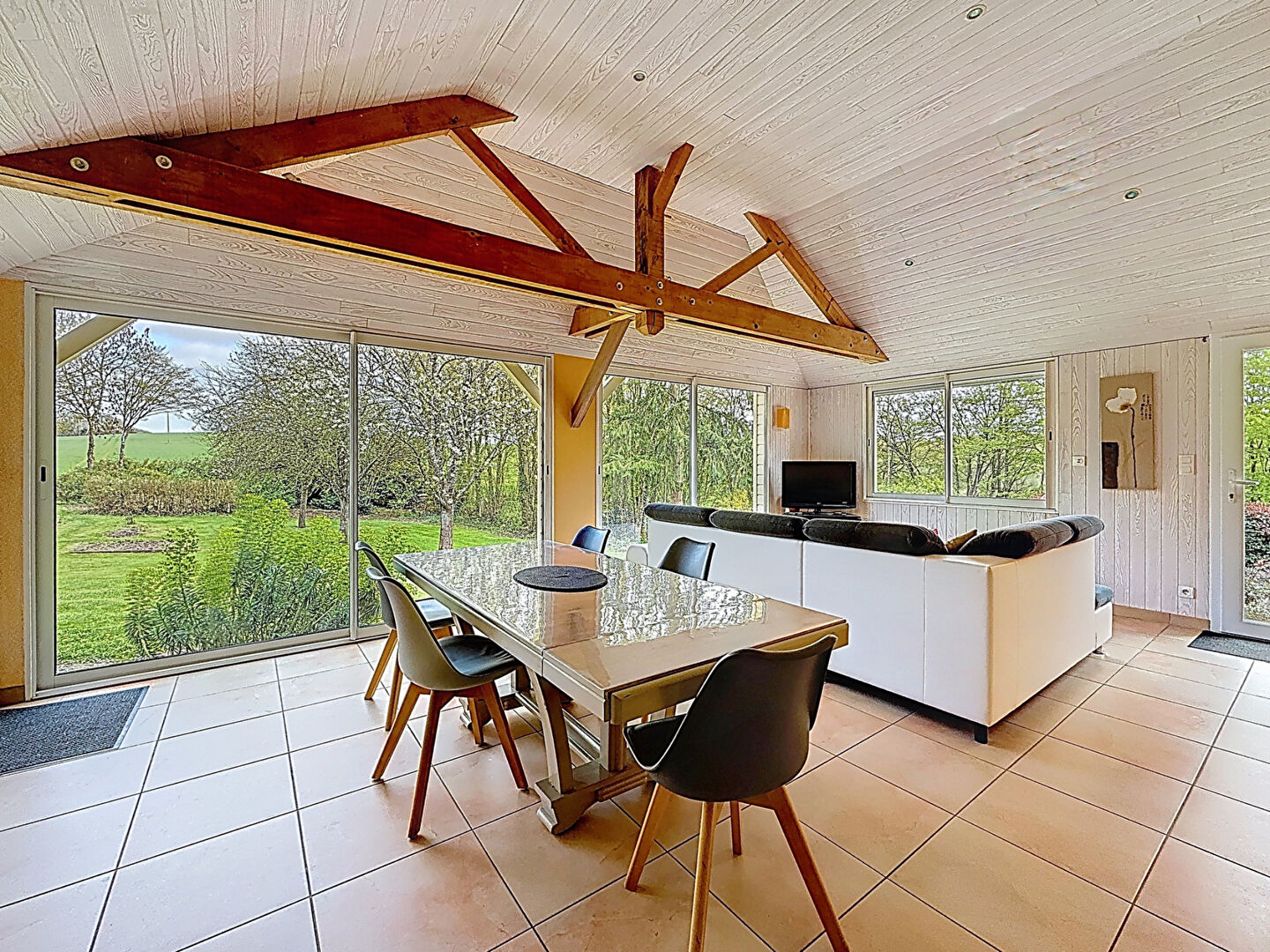 Dès l'entrée, vous profitez d'une agréable véranda offrant une vue dégagée sur le jardin et les champs environnants.