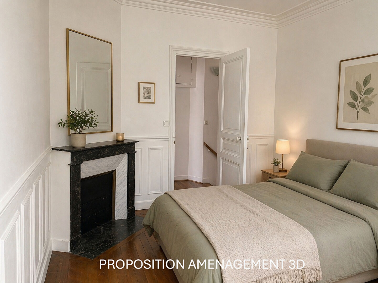 -une grande chambre de 14 m² avec cheminée en marbre,