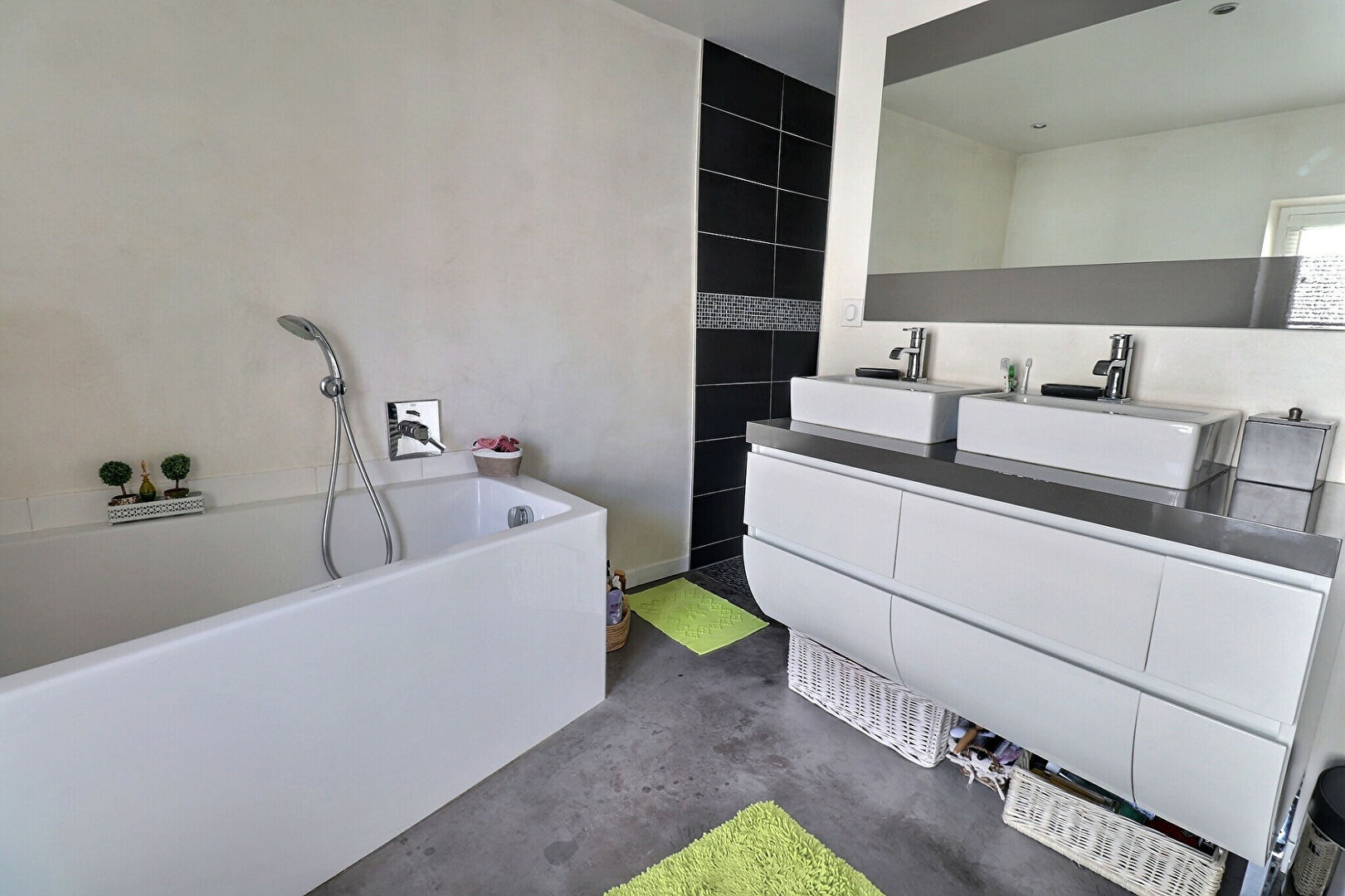 Le rez-de-chaussée accueille une cuisine aménagée et équipée aux lignes modernes et fonctionnelles, une salle à manger, un séjour lumineux et des WC. Cet espace ouvert mais bien délimité par un jeu de marches est entièrement enduit de béton ciré au sol et stuc aux murs, sa poudre de marbre et ses pigments lui conférant un éclat unique.