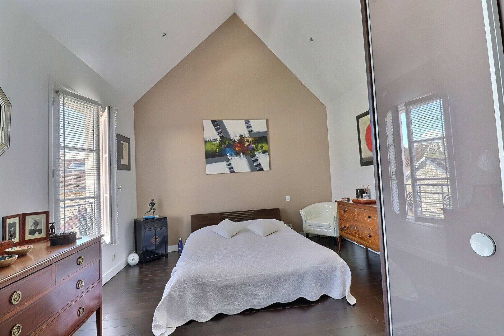 Au second étage, un très bel espace de 25 m² à hauteur cathédrale est aménagé en chambre parentale avec un grand dressing sur mesure et offre une vue magnifique sur le château de Maisons-Laffitte.
