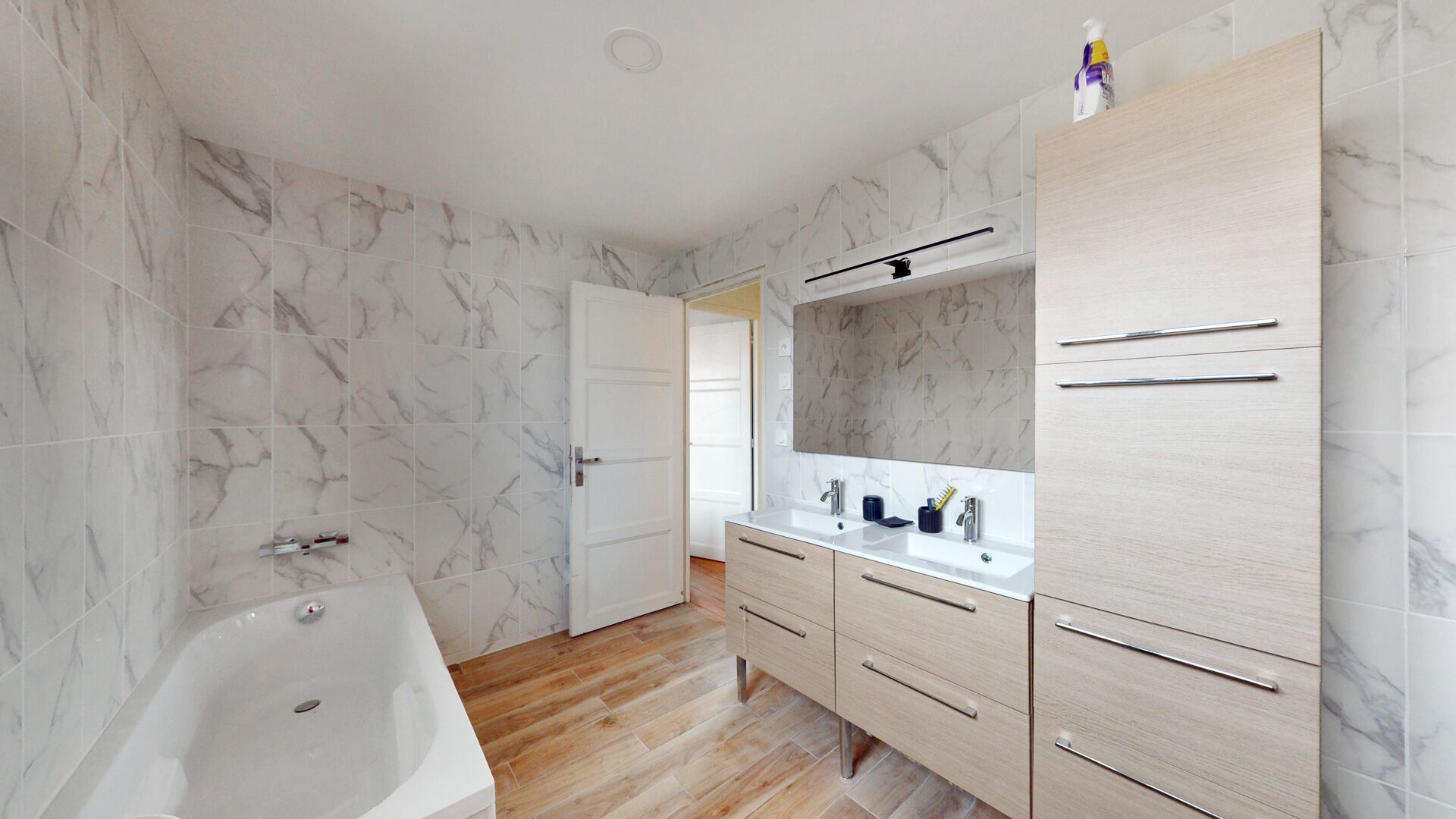 A l'étage: un palier desservant 3 chambres, une salle de bains avec un wc.