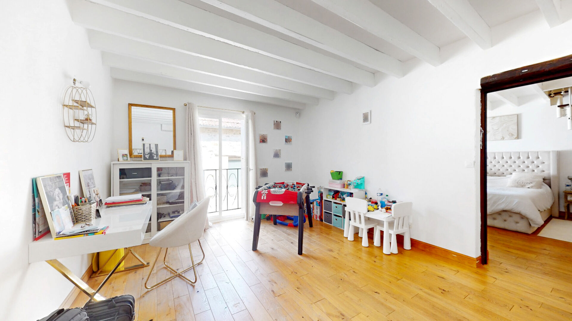 A l'étage, Un grand palier avec son espace salle de jeux ou bureau, une salle de bains, un wc, 2 chambres et une suite parentale avec sa salle d'eau et son accès au dressing.