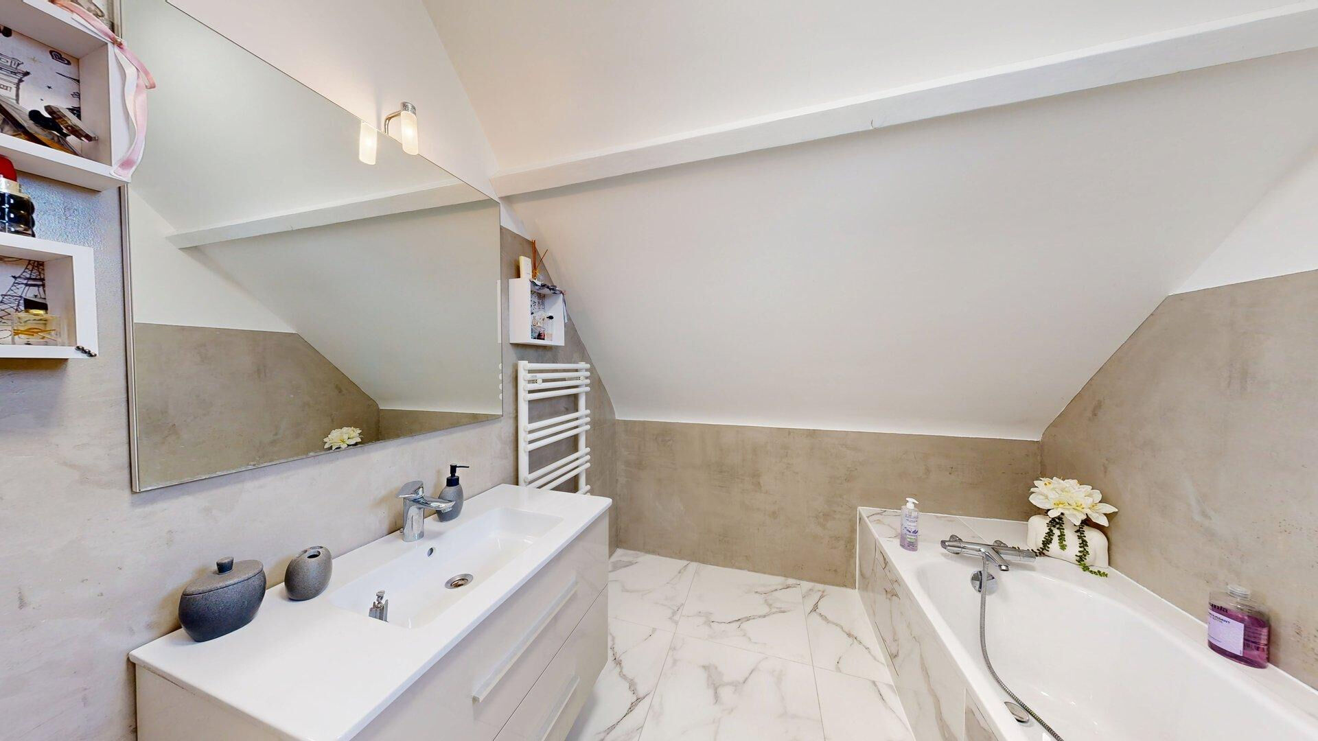 Au premier étage, en plus des trois chambres, vous disposerez d'une salle de bain et d'un WC indépendant. Le tout repose sur un sous-sol total avec garage (porte motorisée).
