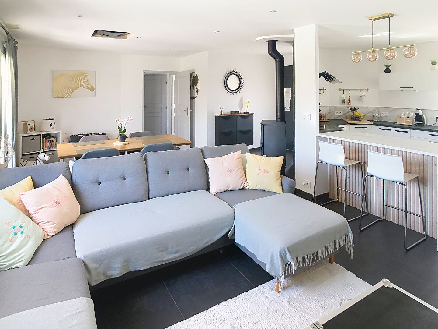 À proximité des commerces et du bus scolaire, vous serez sous le charme de cette belle villa moderne avec sa pièce de vie spacieuse et lumineuse, disposant d'un poêle à bois et ouverte sur une cuisine équipée et une buanderie.