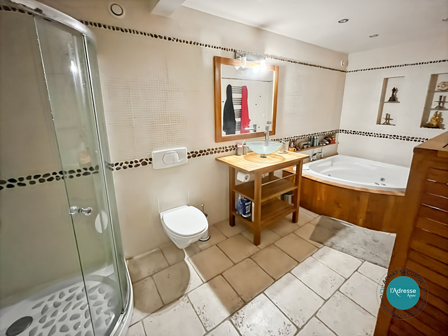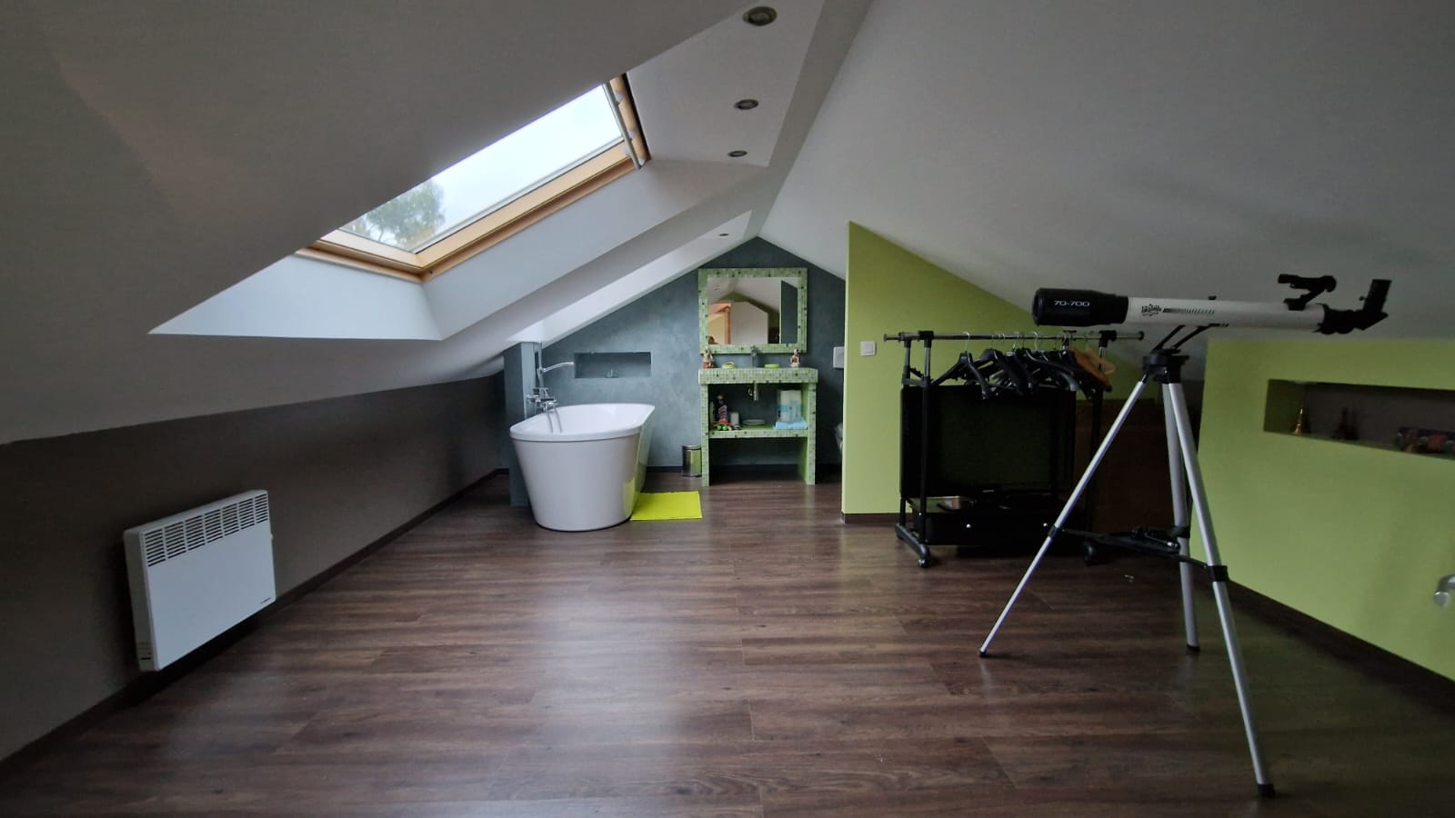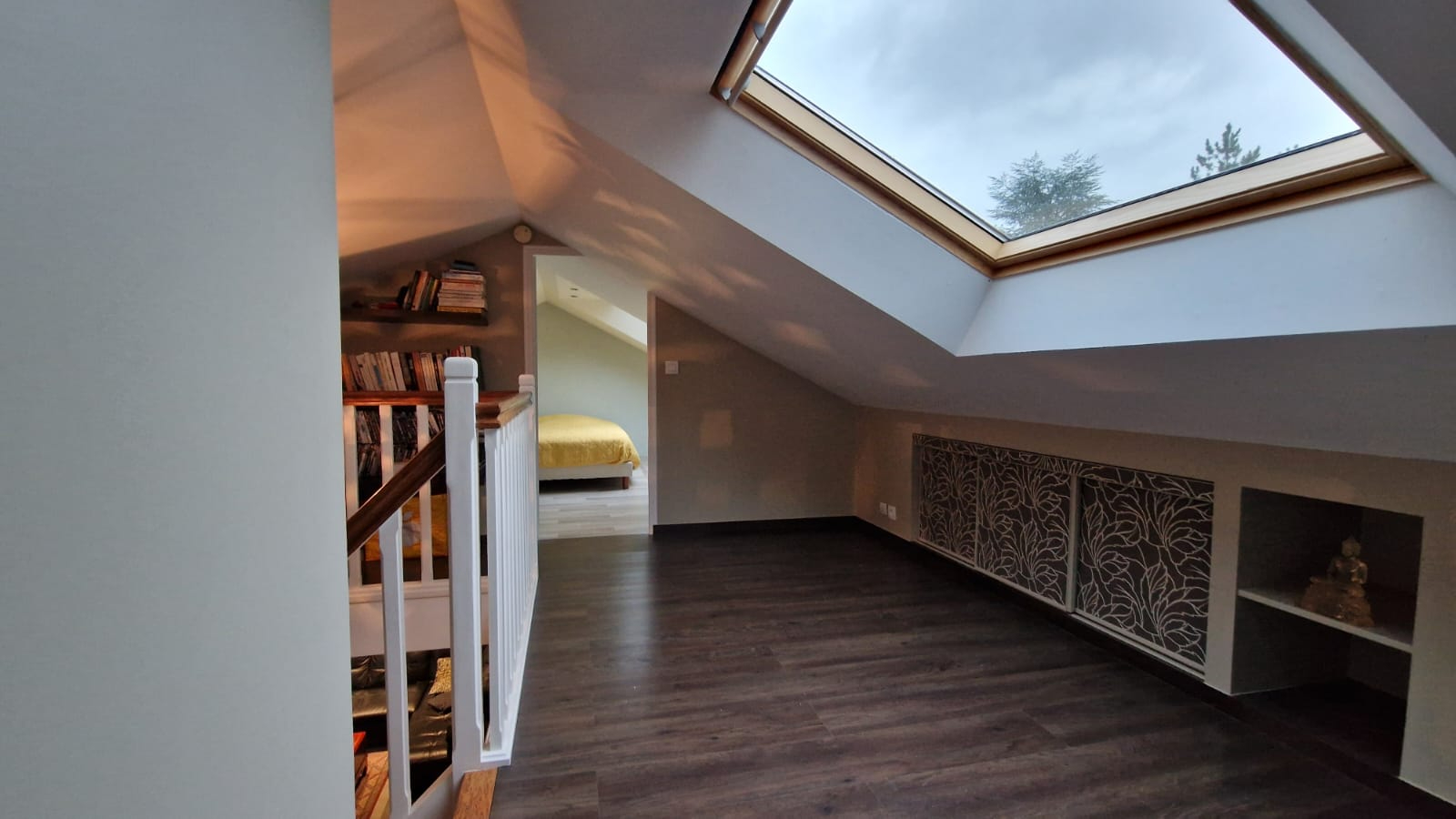 A l'étage : Palier desservant une chambre et une salle de bains baignoire ilot avec W.C.