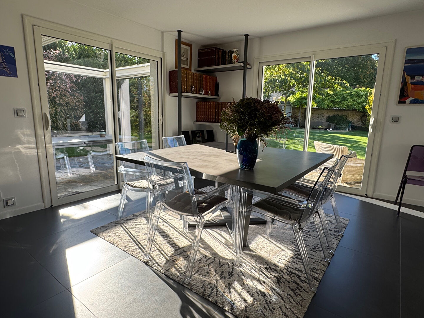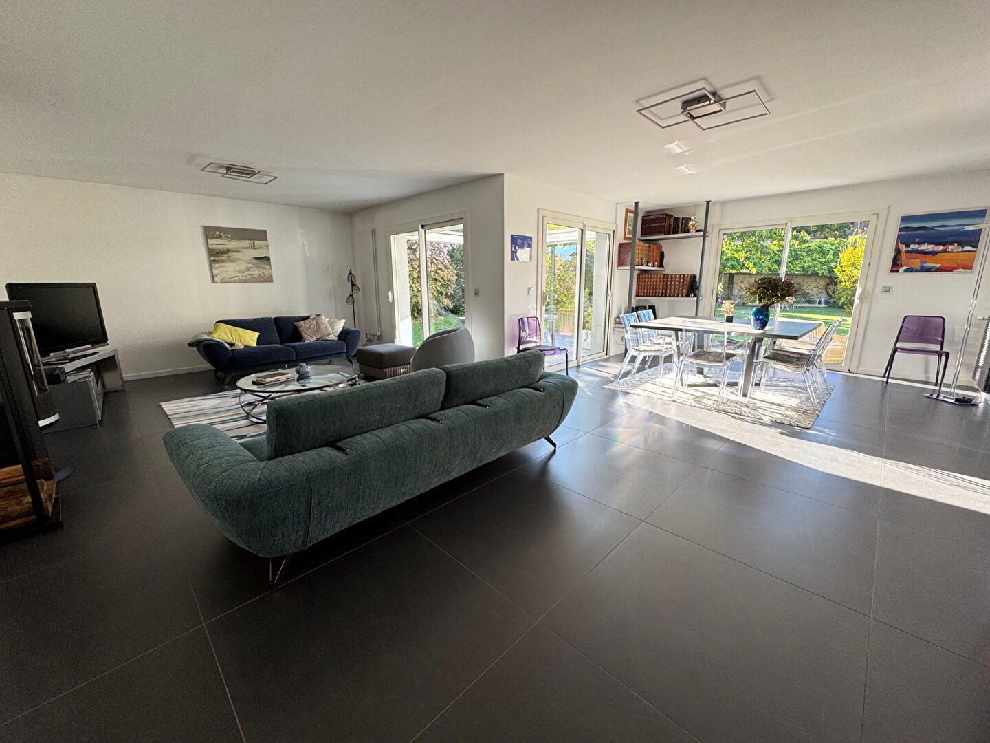Grâce aux larges baies vitrées, cette pièce est très lumineuse et offre un accès sur le jardin et sur une terrasse avec une pergola bioclimatique rétractable.