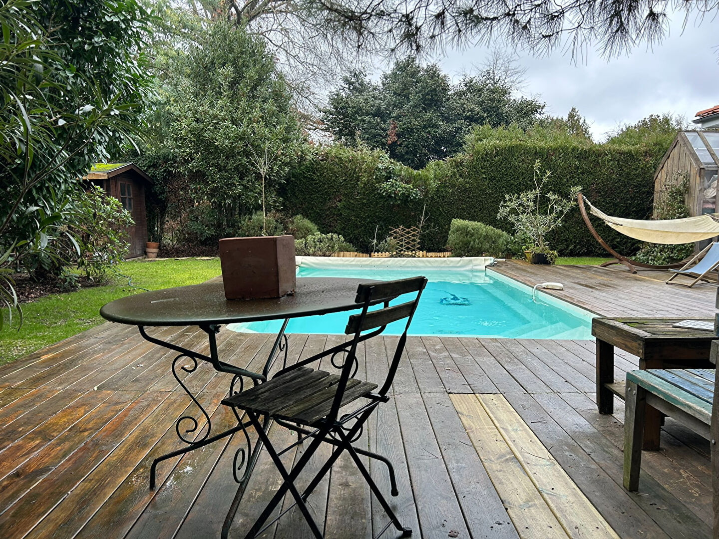 À l'extérieur, sans aucun vis-à-vis, profitez d'une agréable terrasse avec piscine, d'un jardin arboré et de deux abris de rangement, idéals pour le stockage.