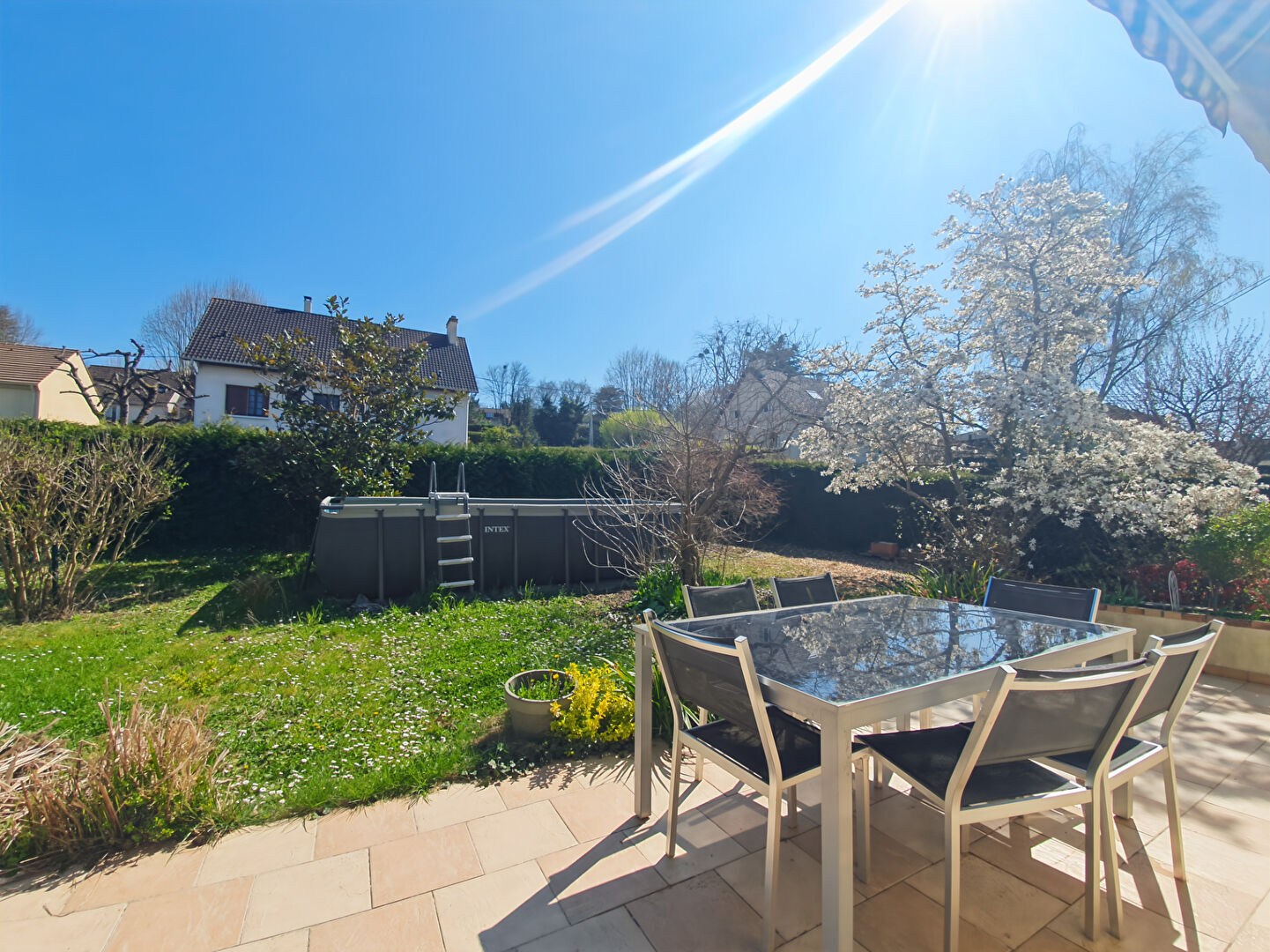 Un beau jardin arboré et clos avec abri de jardin, piscine hors sol, portail et porte de garage électriques complètent ce bien en bon état général.