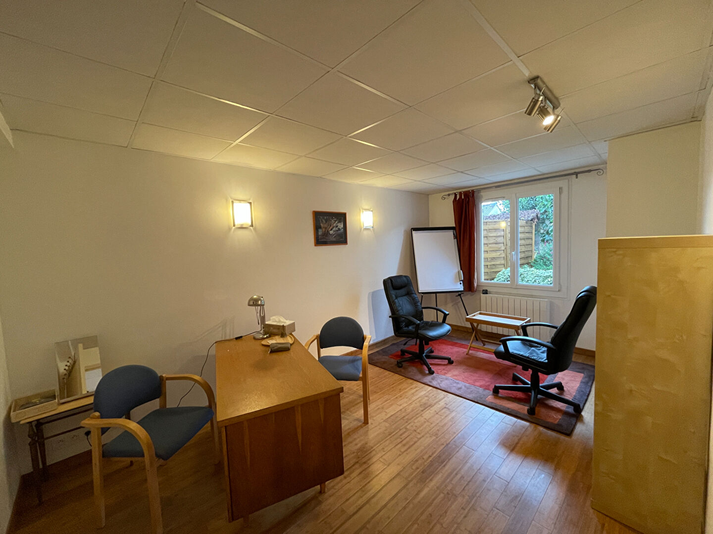 Au rez-de-jardin: un local professionnel comprenant une grande salle de réunion, un coin cuisine, un bureau et un WC.