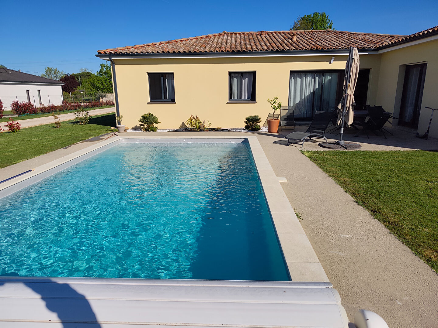 Implantée sur un terrain d'environ 1 600 m², la propriété bénéficie d'un extérieur soigné avec une piscine 8x4 mètres sécurisée par un volet roulant, idéale pour profiter des beaux jours en toute tranquillité.