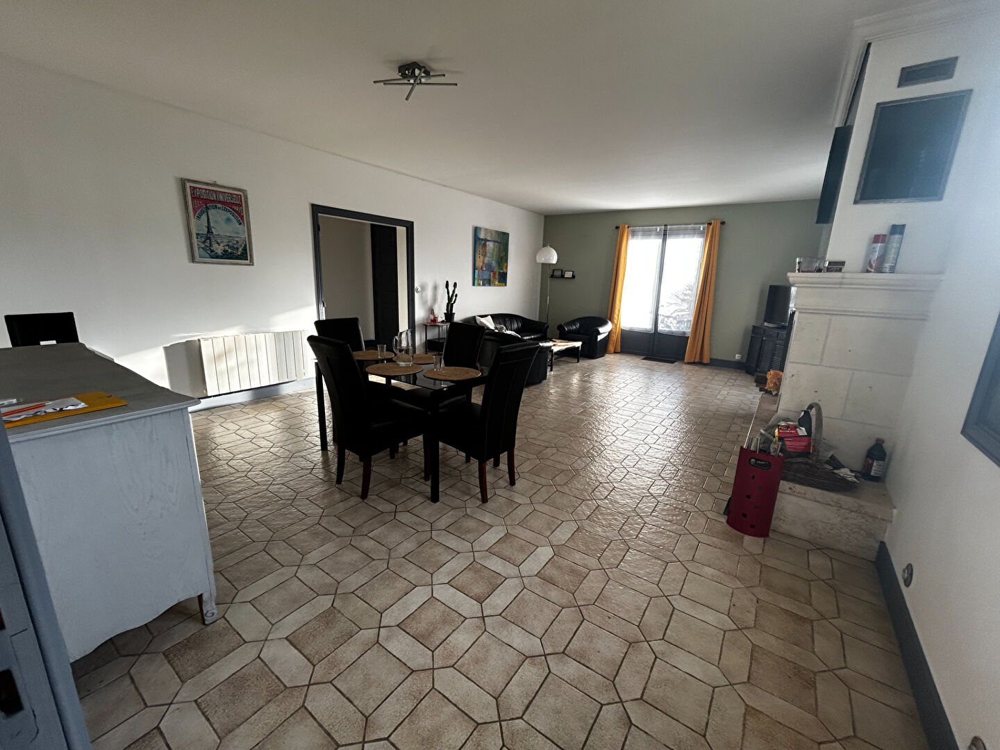 Un vaste salon ouvert sur une cuisine équipée