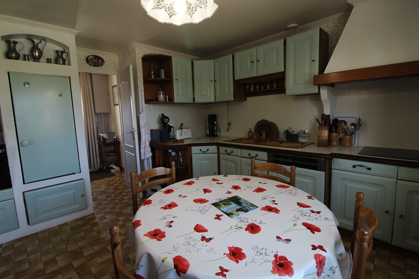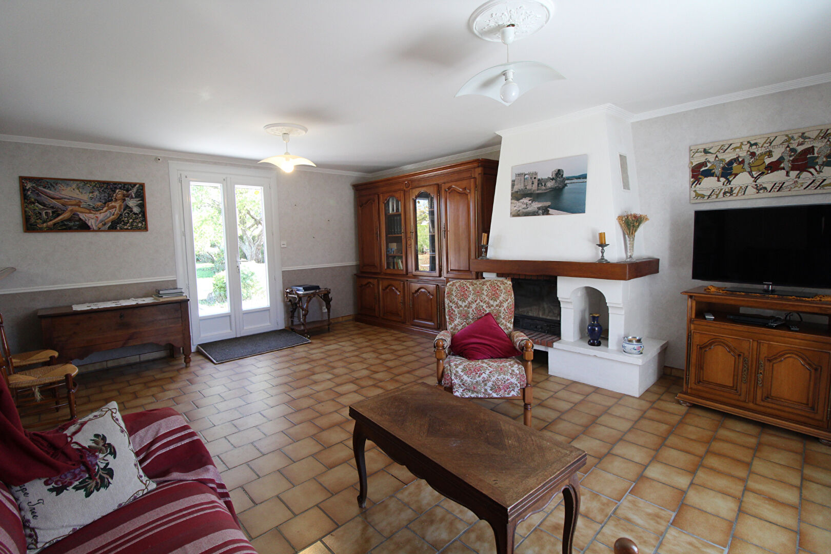 Entrée avec placard, séjour-salon avec cheminée-insert, cuisine aménagée et équipée.